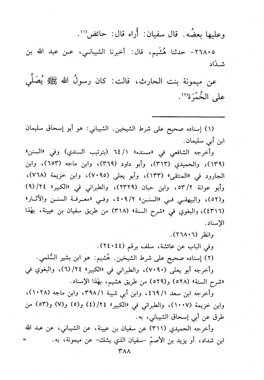 ٢٦٨٠٥ - حَدَّثَنَا هُشَيْمٌ، قَالَ: أَخْبَرَنَا الشَّيْبَانِيُّ، عَنْ عَبْدِ اللهِ بْنِ شَدَّادٍ، عَنْ مَيْمُونَةَ بِنْتِ الْحَارِثِ، قَالَتْ: " كَانَ رَسُولُ اللهِ صَلَّى اللهُ عَلَيْهِ وَسَلَّمَ يُصَلِّي عَلَى الْخُمْرَةِ " (٢)