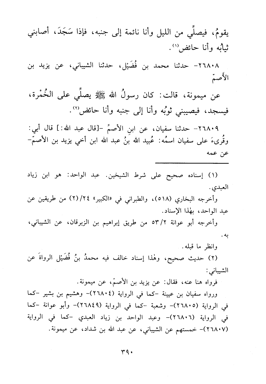 ٢٦٨٠٨ - حَدَّثَنَا مُحَمَّدُ بْنُ فُضَيْلٍ، حَدَّثَنَا الشَّيْبَانِيُّ، عَنْ يَزِيدَ بْنِ الْأَصَمِّ، عَنْ مَيْمُونَةَ، قَالَتْ: " كَانَ رَسُولُ اللهِ صَلَّى اللهُ عَلَيْهِ وَسَلَّمَ يُصَلِّي عَلَى الْخُمْرَةِ، فَيَسْجُدُ، فَيُصِيبُنِي ثَوْبُهُ وَأَنَا إِلَى جَنْبِهِ وَأَنَا حَائِضٌ " (٢)