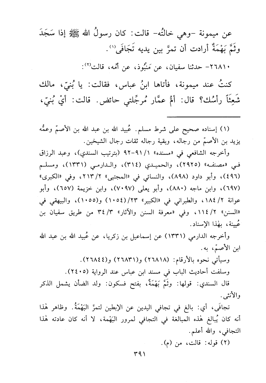 عَنْ مَيْمُونَةَ، وَهِيَ خَالَتُهُ، قَالَتْ: " كَانَ رَسُولُ اللهِ صَلَّى اللهُ عَلَيْهِ وَسَلَّمَ إِذَا سَجَدَ وَثَمَّ بَهْمَةٌ أَرَادَتْ أَنْ تَمُرَّ بَيْنَ يَدَيْهِ تَجَافَى " (١)