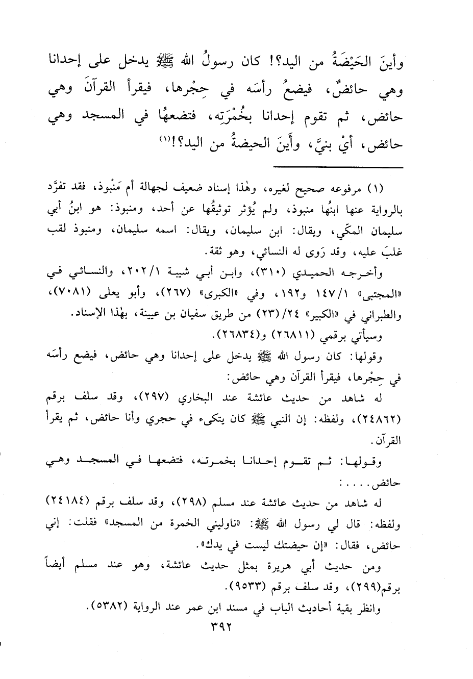 وَأَيْنَ الْحَيْضَةُ مِنَ الْيَدِ؟ " كَانَ رَسُولُ اللهِ صَلَّى اللهُ عَلَيْهِ وَسَلَّمَ يَدْخُلُ عَلَى إِحْدَانَا وَهِيَ حَائِضٌ، فَيَضَعُ رَأْسَهُ فِي حِجْرِهَا، فَيَقْرَأُ الْقُرْآنَ وَهِيَ حَائِضٌ، ثُمَّ تَقُومُ إِحْدَانَا بِخُمْرَتِهِ، فَتَضَعُهَا فِي الْمَسْجِدِ وَهِيَ حَائِضٌ "، أَيْ بُنَيَّ، وَأَيْنَ الْحَيْضَةُ مِنَ الْيَدِ؟ (١)