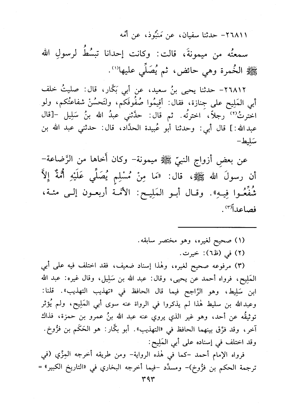 ٢٦٨١٢ - حَدَّثَنَا يَحْيَى بْنُ سَعِيدٍ، عَنْ أَبِي بَكَّارٍ، قَالَ: صَلَّيْتُ خَلْفَ أَبِي الْمَلِيحِ، عَلَى جَنَازَةٍ فَقَالَ: أَقِيمُوا صُفُوفَكُمْ، وَلْتَحْسُنْ شَفَاعَتُكُمْ، وَلَوْ اخْتَرْتُ (٢) رَجُلًا، اخْتَرْتُهُ، ثُمَّ، قَالَ: حَدَّثَنِي عَبْدُ اللهِ بْنُ سَلِيلٍ، [قَالَ عَبْدُ اللهِ:] قَالَ أَبِي: وحَدَّثَنَا أَبُو عُبَيْدَةَ الْحَدَّادُ، قَالَ: حَدَّثَنِي عَبْدُ اللهِ بْنُ سَلِيطٍ، عَنْ بَعْضِ أَزْوَاجِ النَّبِيِّ صَلَّى اللهُ عَلَيْهِ وَسَلَّمَ مَيْمُونَةَ، وَكَانَ أَخَاهَا مِنَ الرَّضَاعَةِ، أَنَّ رَسُولَ اللهِ صَلَّى اللهُ عَلَيْهِ وَسَلَّمَ، قَالَ: " مَا مِنْ مُسْلِمٍ يُصَلِّي عَلَيْهِ أُمَّةٌ إِلَّا شُفِّعُوا فِيهِ " وقَالَ أَبُو الْمَلِيحِ: " الْأُمَّةُ أَرْبَعُونَ إِلَى مِائَةٍ، فَصَاعِدًا " (٣)