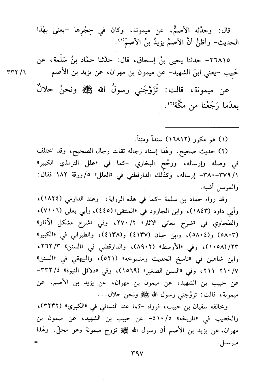 ٢٦٨١٥ - حَدَّثَنَا يَحْيَى بْنُ إِسْحَاقَ، قَالَ: حَدَّثَنَا حَمَّادُ بْنُ سَلَمَةَ، عَنْ حَبِيبٍ يَعْنِي ابْنَ الشَّهِيدِ، عَنْ مَيْمُونِ بْنِ مِهْرَانَ، عَنْ يَزِيدَ بْنِ الْأَصَمِّ، عَنْ مَيْمُونَةَ، قَالَتْ: " تَزَوَّجَنِي رَسُولُ اللهِ صَلَّى اللهُ عَلَيْهِ وَسَلَّمَ وَنَحْنُ حَلَالٌ بَعْدَمَا رَجَعْنَا مِنْ مَكَّةَ " (٢)