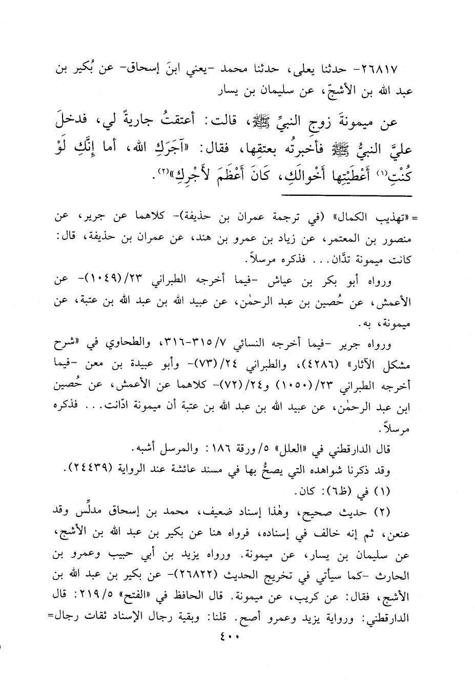 ٢٦٨١٧ - حَدَّثَنَا يَعْلَى، حَدَّثَنَا مُحَمَّدٌ يَعْنِي ابْنَ إِسْحَاقَ، عَنْ بُكَيْرِ بْنِ عَبْدِ اللهِ بْنِ الْأَشَجِّ، عَنْ سُلَيْمَانَ بْنِ يَسَارٍ، عَنْ مَيْمُونَةَ، زَوْجِ النَّبِيِّ صَلَّى اللهُ عَلَيْهِ وَسَلَّمَ قَالَتْ: أَعْتَقْتُ جَارِيَةً لِي، فَدَخَلَ عَلَيَّ النَّبِيُّ صَلَّى اللهُ عَلَيْهِ وَسَلَّمَ فَأَخْبَرْتُهُ بِعِتْقِهَا، فَقَالَ: " آجَرَكِ اللهُ، أَمَا إِنَّكِ لَوْ كُنْتِ (١) أَعْطَيْتِهَا أَخْوَالَكِ، كَانَ أَعْظَمَ لِأَجْرِكِ " (٢)