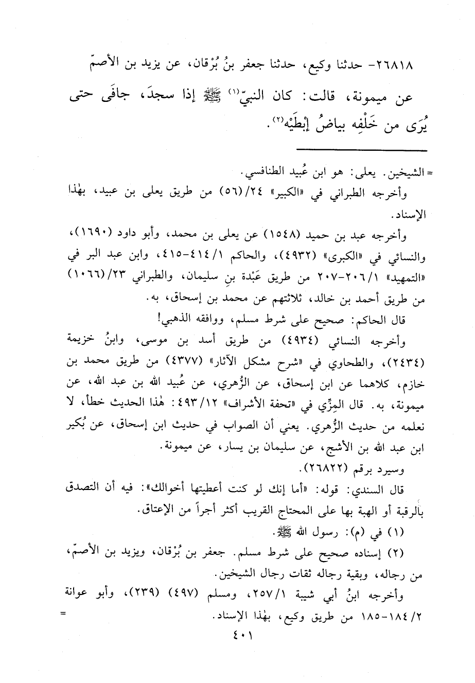٢٦٨١٨ - حَدَّثَنَا وَكِيعٌ، حَدَّثَنَا جَعْفَرُ بْنُ بُرْقَانَ، عَنْ يَزِيدَ بْنِ الْأَصَمِّ، عَنْ مَيْمُونَةَ، قَالَتْ: " كَانَ النَّبِيُّ (١) صَلَّى اللهُ عَلَيْهِ وَسَلَّمَ إِذَا سَجَدَ، جَافَى حَتَّى يَرَى مَنْ خَلْفَهُ بَيَاضَ إِبْطَيْهِ " (٢)