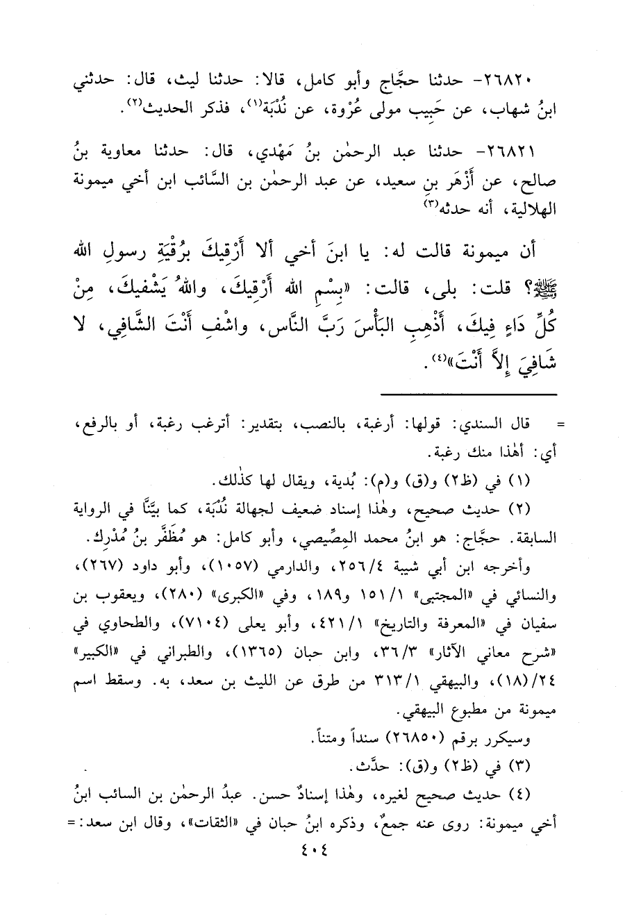 ٢٦٨٢١ - حَدَّثَنَا عَبْدُ الرَّحْمَنِ بْنُ مَهْدِيٍّ، قَالَ: حَدَّثَنَا مُعَاوِيَةُ بْنُ صَالِحٍ، عَنْ أَزْهَرَ بْنِ سَعِيدٍ، عَنْ عَبْدِ الرَّحْمَنِ بْنِ السَّائِبِ، ابْنِ أَخِي مَيْمُونَةَ الْهِلَالِيَّةِ، أَنَّهُ حَدَّثَهُ (٣) أَنَّ مَيْمُونَةَ، قَالَتْ لَهُ: يَا ابْنَ أَخِي، أَلَا أَرْقِيكَ بِرُقْيَةِ رَسُولِ اللهِ صَلَّى اللهُ عَلَيْهِ وَسَلَّمَ؟ قُلْتُ: بَلَى، قَالَتْ: " بِسْمِ اللهِ أَرْقِيكَ، وَاللهُ يَشْفِيكَ، مِنْ كُلِّ دَاءٍ فِيكَ، أَذْهِبِ الْبَاسَ رَبَّ النَّاسِ، وَاشْفِ أَنْتَ الشَّافِي، لَا شَافِيَ إِلَّا أَنْتَ " (٤)