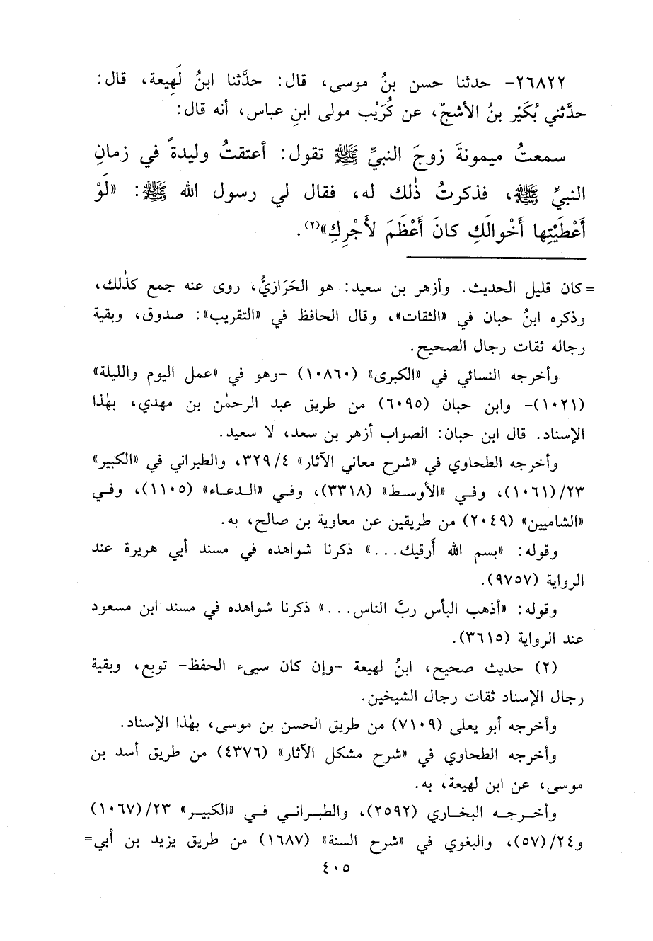 ٢٦٨٢٢ - حَدَّثَنَا حَسَنُ بْنُ مُوسَى، قَالَ: حَدَّثَنَا ابْنُ لَهِيعَةَ، قَالَ: حَدَّثَنِي بُكَيْرُ بْنُ الْأَشَجِّ، عَنْ كُرَيْبٍ، مَوْلَى ابْنِ عَبَّاسٍ، أَنَّهُ قَالَ: سَمِعْتُ مَيْمُونَةَ، زَوْجَ النَّبِيِّ صَلَّى اللهُ عَلَيْهِ وَسَلَّمَ تَقُولُ: أَعْتَقْتُ وَلِيدَةً فِي زَمَانِ النَّبِيِّ صَلَّى اللهُ عَلَيْهِ وَسَلَّمَ، فَذَكَرْتُ ذَلِكَ لَهُ، فَقَالَ لِي رَسُولُ اللهِ صَلَّى اللهُ عَلَيْهِ وَسَلَّمَ: " لَوْ أَعْطَيْتِهَا أَخْوَالَكِ كَانَ أَعْظَمَ لِأَجْرِكِ " (١)