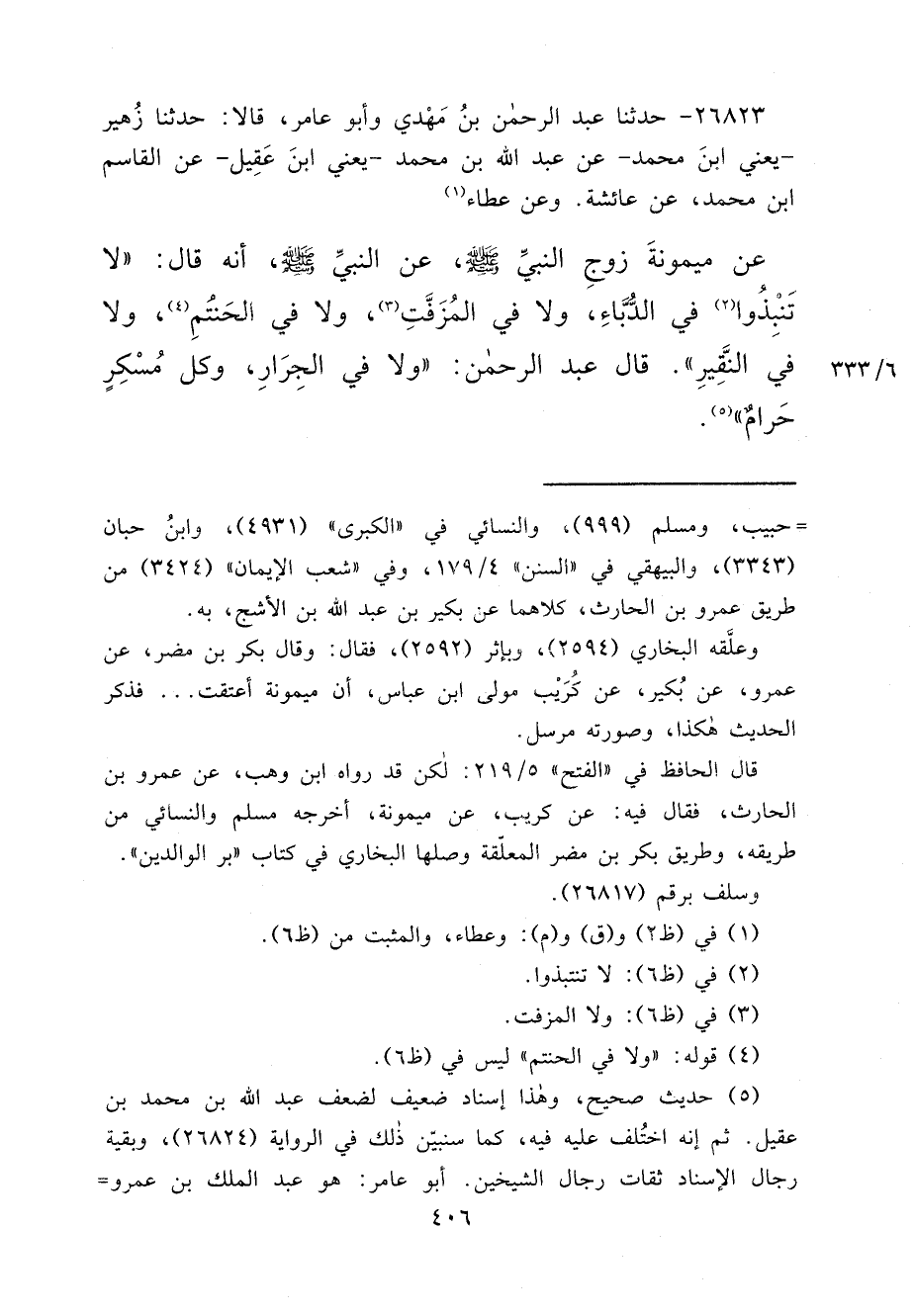 ٢٦٨٢٣ - حَدَّثَنَا عَبْدُ الرَّحْمَنِ بْنُ مَهْدِيٍّ، وَأَبُو عَامِرٍ، قَالَا: حَدَّثَنَا زُهَيْرٌ يَعْنِي ابْنَ مُحَمَّدٍ، عَنْ عَبْدِ اللهِ بْنِ مُحَمَّدٍ يَعْنِي ابْنَ عَقِيلٍ، عَنِ الْقَاسِمِ ابْنِ مُحَمَّدٍ، عَنْ عَائِشَةَ، وَعَطَاءٍ (١) ، عَنْ مَيْمُونَةَ، زَوْجِ النَّبِيِّ صَلَّى اللهُ عَلَيْهِ وَسَلَّمَ، عَنِ النَّبِيِّ صَلَّى اللهُ عَلَيْهِ وَسَلَّمَ، أَنَّهُ قَالَ: " لَا تَنْبِذُوا (٢) فِي الدُّبَّاءِ، وَلَا فِي الْمُزَفَّتِ (٣) ، وَلَا فِي الْحَنْتَمِ (٤) ، وَلَا فِي النَّقِيرِ " قَالَ عَبْدُ الرَّحْمَنِ: " وَلَا فِي الْجِرَارِ، وَكُلُّ مُسْكِرٍ حَرَامٌ " (٥)