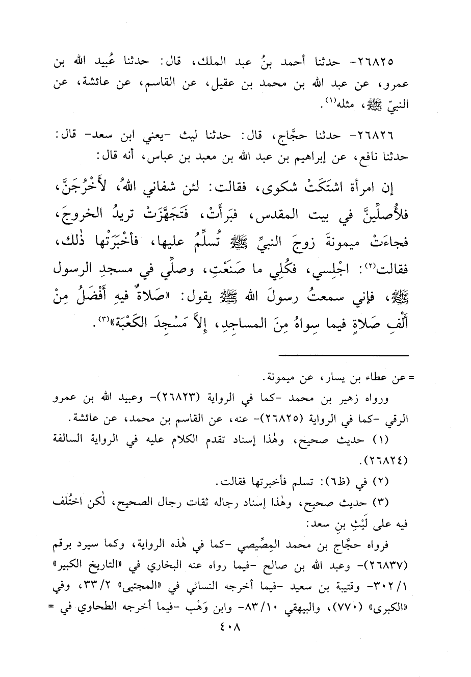 ٢٦٨٢٦ - حَدَّثَنَا حَجَّاجٌ، قَالَ: حَدَّثَنَا لَيْثٌ يَعْنِي ابْنَ سَعْدٍ، قَالَ: حَدَّثَنَا نَافِعٌ، عَنْ إِبْرَاهِيمَ بْنِ عَبْدِ اللهِ بْنِ مَعْبَدِ بْنِ عَبَّاسٍ، أَنَّهُ قَالَ: إِنَّ امْرَأَةً اشْتَكَتْ شَكْوَى، فَقَالَتْ: لَئِنْ شَفَانِي اللهُ، لَأَخْرُجَنَّ، فَلَأُصَلِّيَنَّ فِي بَيْتِ الْمَقْدِسِ، فَبَرِأَتْ، فَتَجَهَّزَتْ تُرِيدُ الْخُرُوجَ، فَجَاءَتْ مَيْمُونَةَ، زَوْجَ النَّبِيِّ صَلَّى اللهُ عَلَيْهِ وَسَلَّمَ تُسَلِّمُ عَلَيْهَا، فَأَخْبَرَتْهَا ذَلِكَ، فَقَالَتْ (٢) : اجْلِسِي، فَكُلِي مَا صَنَعْتُ، وَصَلِّي فِي مَسْجِدِ الرَّسُولِ صَلَّى اللهُ عَلَيْهِ وَسَلَّمَ، فَإِنِّي سَمِعْتُ رَسُولَ اللهِ صَلَّى اللهُ عَلَيْهِ وَسَلَّمَ يَقُولُ: " صَلَاةٌ فِيهِ أَفْضَلُ مِنْ أَلْفِ صَلَاةٍ فِيمَا سِوَاهُ مِنَ الْمَسَاجِدِ، إِلَّا مَسْجِدَ الْكَعْبَةِ " (٣)
