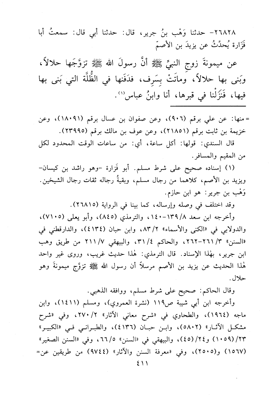 ٢٦٨٢٨ - حَدَّثَنَا وَهْبُ بْنُ جَرِيرٍ، قَالَ: حَدَّثَنَا أَبِي، قَالَ: سَمِعْتُ أَبَا فَزَارَةَ، يُحَدِّثُ عَنْ يَزِيدَ بْنِ الْأَصَمِّ، عَنْ مَيْمُونَةَ، زَوْجِ النَّبِيِّ صَلَّى اللهُ عَلَيْهِ وَسَلَّمَ " أَنَّ رَسُولَ اللهِ صَلَّى اللهُ عَلَيْهِ وَسَلَّمَ تَزَوَّجَهَا حَلَالًا، وَبَنَى بِهَا حَلَالًا، وَمَاتَتْ بِسَرِفَ، فَدَفَنَهَا فِي الظُّلَّةِ الَّتِي بَنَى بِهَا فِيهَا "، فَنَزَلْنَا فِي قَبْرِهَا، أَنَا وَابْنُ عَبَّاسٍ (١)