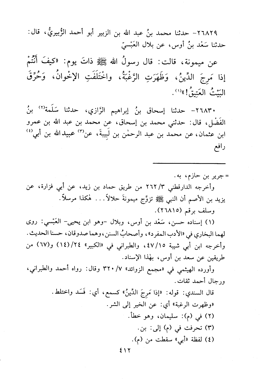 ٢٦٨٢٩ - حَدَّثَنَا مُحَمَّدُ بْنُ عَبْدِ اللهِ بْنِ الزُّبَيْرِ أَبُو أَحْمَدَ الزُّبَيْرِيُّ، قَالَ: حَدَّثَنَا سَعْدُ بْنُ أَوْسٍ، عَنْ بِلَالٍ الْعَبْسِيِّ، عَنْ مَيْمُونَةَ، قَالَتْ: قَالَ رَسُولُ اللهِ صَلَّى اللهُ عَلَيْهِ وَسَلَّمَ ذَاتَ يَوْمٍ: " كَيْفَ أَنْتُمْ إِذَا مَرِجَ الدِّينُ، وَظَهَرَتِ الرَّغْبَةُ، وَاخْتَلَفَتِ الْإِخْوَانُ، وَحُرِّقَ الْبَيْتُ الْعَتِيقُ " (١)