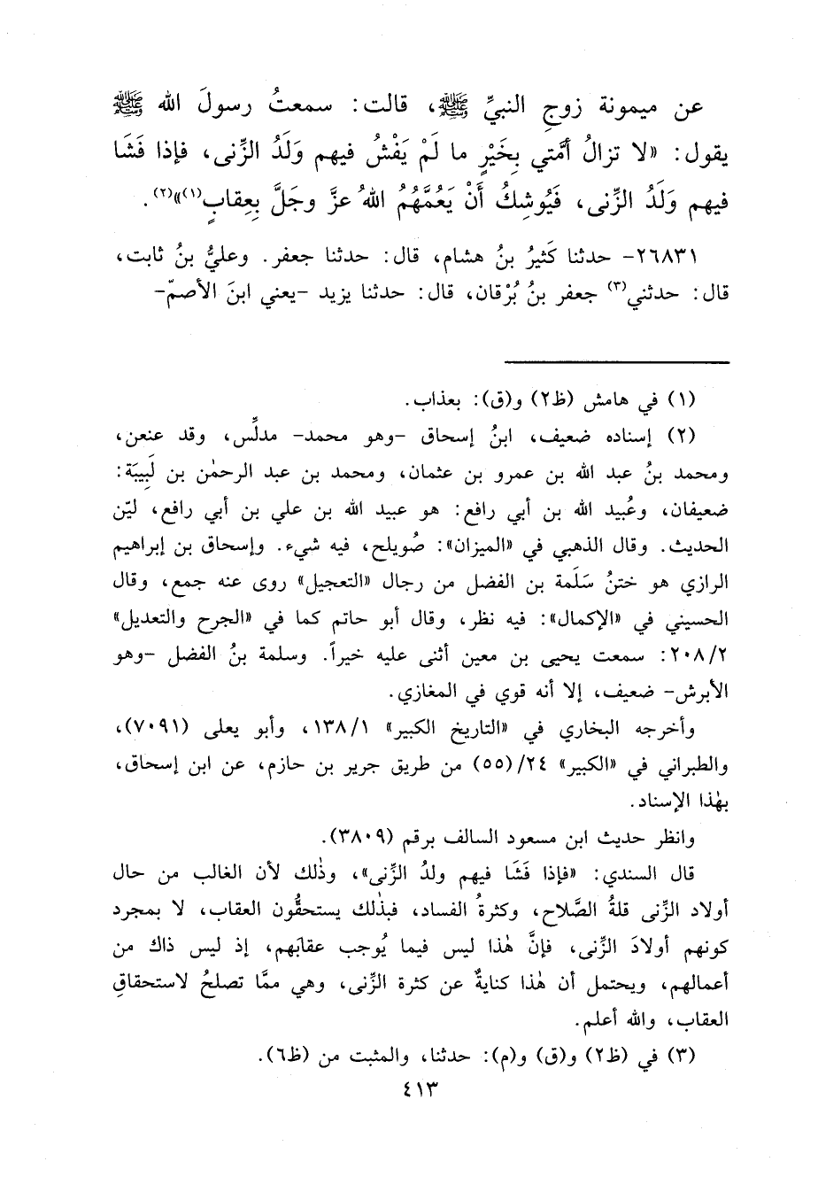 عَنْ مَيْمُونَةَ، زَوْجِ النَّبِيِّ صَلَّى اللهُ عَلَيْهِ وَسَلَّمَ، قَالَتْ: سَمِعْتُ رَسُولَ اللهِ صَلَّى اللهُ عَلَيْهِ وَسَلَّمَ يَقُولُ: " لَا تَزَالُ أُمَّتِي بِخَيْرٍ مَا لَمْ يَفْشُ فِيهِمْ وَلَدُ الزِّنَا، فَإِذَا فَشَا فِيهِمْ وَلَدُ الزِّنَا، فَيُوشِكُ أَنْ يَعُمَّهُمُ اللهُ عَزَّ وَجَلَّ بِعِقَابٍ (١) " (٢)