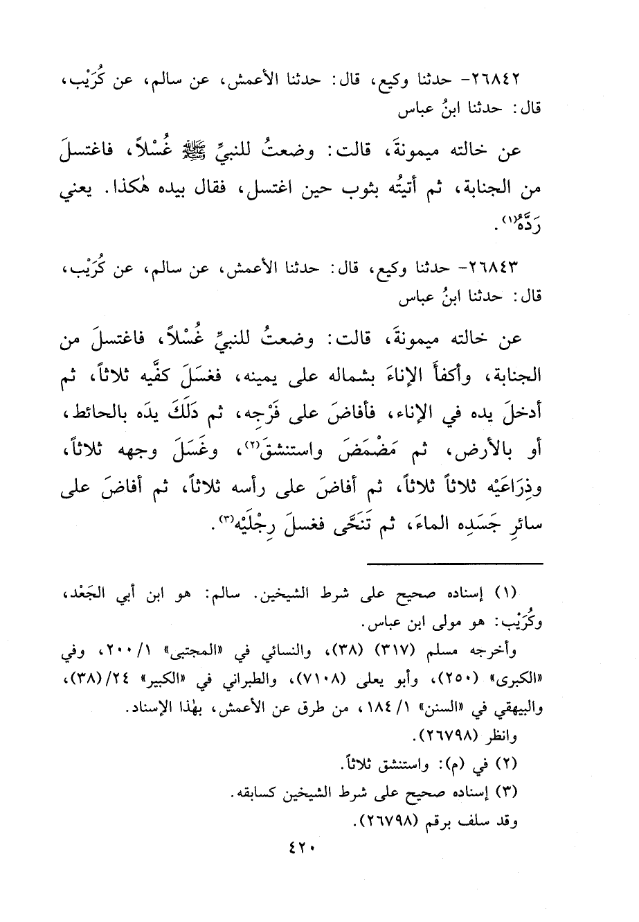 ٢٦٨٤٣ - حَدَّثَنَا وَكِيعٌ، قَالَ: حَدَّثَنَا الْأَعْمَشُ، عَنْ سَالِمٍ، عَنْ كُرَيْبٍ، قَالَ: حَدَّثَنَا ابْنُ عَبَّاسٍ، عَنْ خَالَتِهِ مَيْمُونَةَ، قَالَتْ: " وَضَعْتُ لِلنَّبِيِّ صَلَّى اللهُ عَلَيْهِ وَسَلَّمَ غِسْلًا، فَاغْتَسَلَ مِنَ الْجَنَابَةِ، وَأَكْفَأَ الْإِنَاءَ بِشِمَالِهِ عَلَى يَمِينِهِ، فَغَسَلَ كَفَّيْهِ ثَلَاثًا، ثُمَّ أَدْخَلَ يَدَهُ فِي الْإِنَاءِ، فَأَفَاضَ عَلَى فَرْجِهِ، ثُمَّ دَلَكَ يَدَهُ بِالْحَائِطِ، أَوِ بِالْأَرْضِ، ثُمَّ مَضْمَضَ وَاسْتَنْشَقَ (٢) ، وَغَسَلَ وَجْهَهُ ثَلَاثًا، وَذِرَاعَيْهِ ثَلَاثًا ثَلَاثًا، ثُمَّ أَفَاضَ عَلَى رَأْسِهِ ثَلَاثًا، ثُمَّ أَفَاضَ عَلَى سَائِرِ جَسَدِهِ الْمَاءَ، ثُمَّ تَنَحَّى فَغَسَلَ رِجْلَيْهِ " (٣)