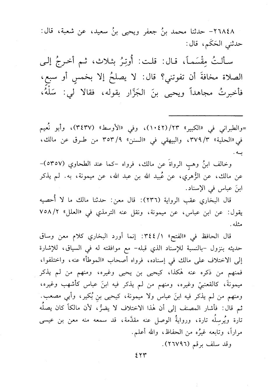 ٢٦٨٤٨ - حَدَّثَنَا مُحَمَّدُ بْنُ جَعْفَرٍ، وَيَحْيَى بْنُ سَعِيدٍ، عَنْ شُعْبَةَ، قَالَ: حَدَّثَنِي الْحَكَمُ، قَالَ: سَأَلْتُ مِقْسَمًا، قَالَ: قُلْتُ: أُوتِرُ بِثَلَاثٍ، ثُمَّ أَخْرُجُ إِلَى الصَّلَاةِ مَخَافَةَ أَنْ تَفُوتَنِي؟ قَالَ: " لَا يَصْلُحُ إِلَّا بِخَمْسٍ أَوْ سَبْعٍ "، فَأَخْبَرْتُ مُجَاهِدًا وَيَحْيَى بْنَ الجَزَّارِ بِقَوْلِهِ، فَقَالَا لِي: سَلْهُ،