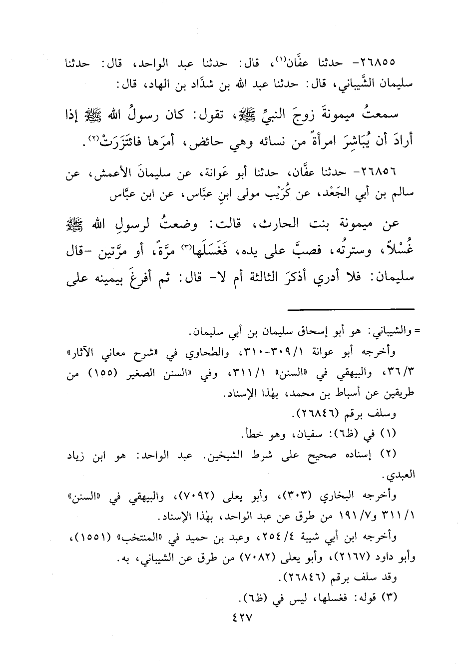 ٢٦٨٥٥ - حَدَّثَنَا عَفَّانُ (١) ، قَالَ: حَدَّثَنَا عَبْدُ الْوَاحِدِ، قَالَ: حَدَّثَنَا سُلَيْمَانُ الشَّيْبَانِيُّ، قَالَ: حَدَّثَنَا عَبْدُ اللهِ بْنُ شَدَّادِ بْنِ الْهَادِ، قَالَ: سَمِعْتُ مَيْمُونَةَ، زَوْجَ النَّبِيِّ صَلَّى اللهُ عَلَيْهِ وَسَلَّمَ تَقُولُ: " كَانَ رَسُولُ اللهِ صَلَّى اللهُ عَلَيْهِ وَسَلَّمَ إِذَا أَرَادَ أَنْ يُبَاشِرَ امْرَأَةً مِنْ نِسَائِهِ وَهِيَ حَائِضٌ، أَمَرَهَا فَائْتَزَرَتْ " (٢)