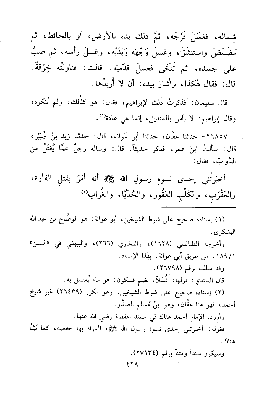 ٢٦٨٥٧ - حَدَّثَنَا عَفَّانُ، حَدَّثَنَا أَبُو عَوَانَةَ، قَالَ: حَدَّثَنَا زَيْدُ بْنُ جُبَيْرٍ، قَالَ: سَأَلْتُ ابْنَ عُمَرَ، فَذَكَرَ حَدِيثًا، قَالَ: وَسَأَلَهُ رَجُلٌ عَمَّا يُقْتَلُ مِنَ الدَّوَابِّ، فَقَالَ: أَخْبَرَتْنِي إِحْدَى نِسْوَةِ رَسُولِ اللهِ، صَلَّى اللهُ عَلَيْهِ وَسَلَّمَ أَنَّهُ " أَمَرَ بِقَتْلِ الْفَأْرَةِ، وَالْعَقْرَبِ، وَالْكَلْبِ الْعَقُورِ، وَالْحُدَيَّا، وَالْغُرَابِ " (٢)
