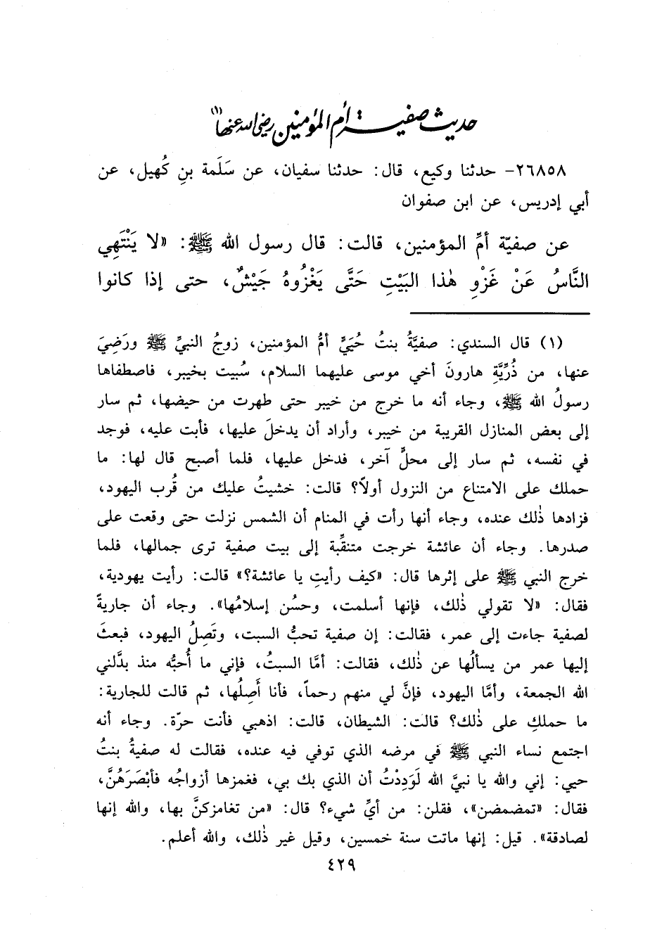 ٢٦٨٥٨ - حَدَّثَنَا وَكِيعٌ، قَالَ: حَدَّثَنَا سُفْيَانُ، عَنْ سَلَمَةَ بْنِ كُهَيْلٍ، عَنْ أَبِي إِدْرِيسَ، عَنِ ابْنِ صَفْوَانَ، عَنْ صَفِيَّةَ، أُمِّ الْمُؤْمِنِينَ، قَالَتْ: قَالَ رَسُولُ اللهِ صَلَّى اللهُ عَلَيْهِ وَسَلَّمَ: " لَا يَنْتَهِي النَّاسُ عَنْ غَزْوِ هَذَا الْبَيْتِ حَتَّى يَغْزُوَهُ جَيْشٌ، حَتَّى إِذَا كَانُوا