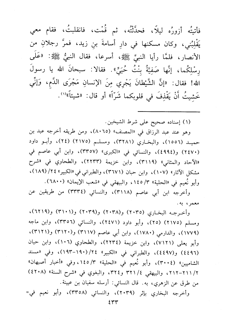 فَأَتَيْتُهُ أَزُورُهُ لَيْلًا، فَحَدَّثْتُهُ، ثُمَّ قُمْتُ، فَانْقَلَبْتُ، فَقَامَ مَعِي يَقْلِبُنِي، وَكَانَ مَسْكَنُهَا فِي دَارِ أُسَامَةَ بْنِ زَيْدٍ، فَمَرَّ رَجُلَانِ مِنَ الْأَنْصَارِ، فَلَمَّا رَأَيَا النَّبِيَّ صَلَّى اللهُ عَلَيْهِ وَسَلَّمَ، أَسْرَعَا، فَقَالَ النَّبِيُّ صَلَّى اللهُ عَلَيْهِ وَسَلَّمَ: " عَلَى رِسْلِكُمَا، إِنَّهَا صَفِيَّةُ بِنْتُ حُيَيٍّ ". فَقَالَا: سُبْحَانَ اللهِ يَا رَسُولَ اللهِ فَقَالَ: " إِنَّ الشَّيْطَانَ يَجْرِي مِنَ الْإِنْسَانِ مَجْرَى الدَّمِ، وَإِنِّي خَشِيتُ أَنْ يَقْذِفَ فِي قُلُوبِكُمَا شَرًّا " أَوْ قَالَ: " شَيْئًا " (١)