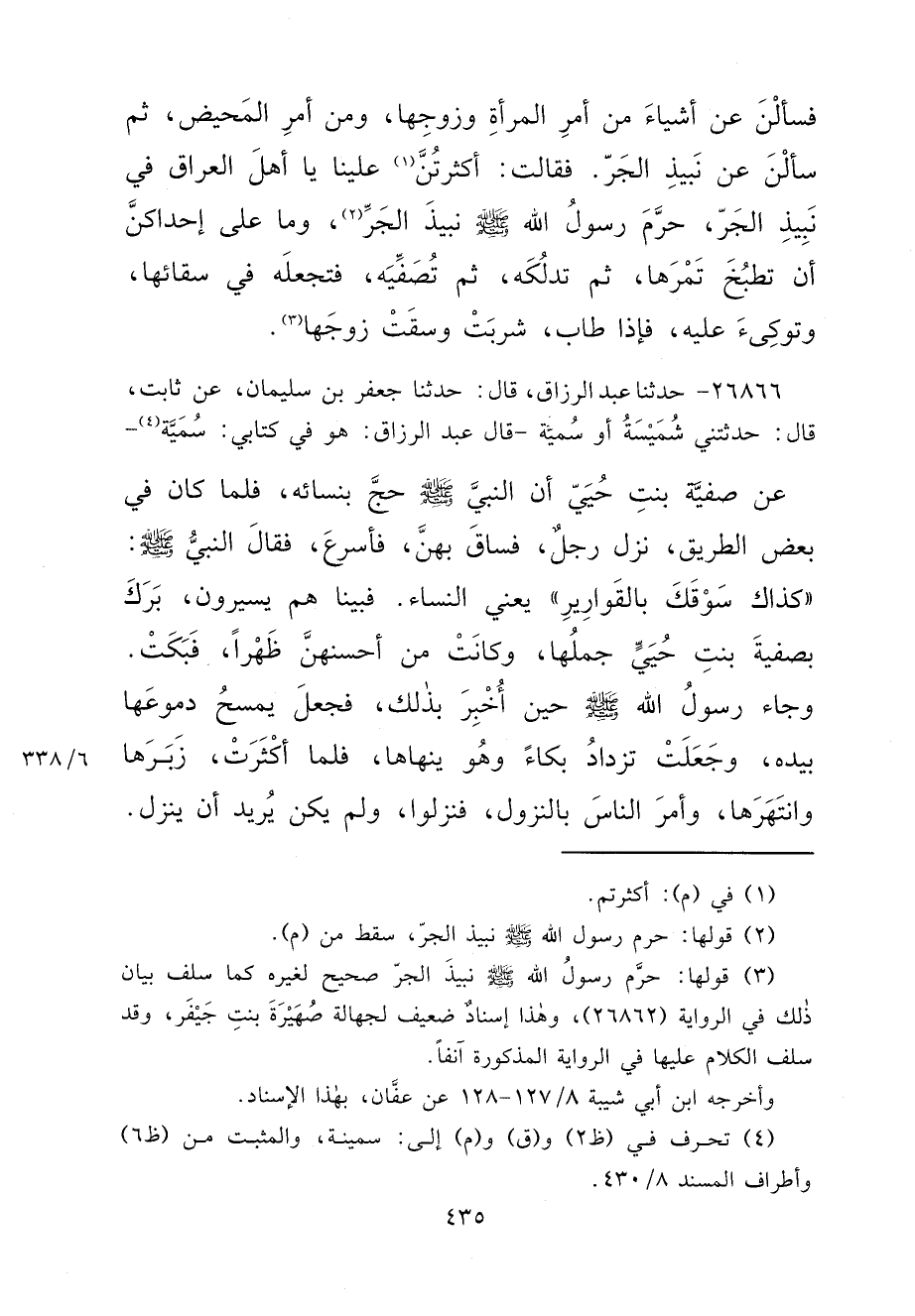 ٢٦٨٦٦ - حَدَّثَنَا عَبْدُ الرَّزَّاقِ، قَالَ: حَدَّثَنَا جَعْفَرُ بْنُ سُلَيْمَانَ، عَنْ ثَابِتٍ، قَالَ: حَدَّثَتْنِي شُمَيْسَةُ، أَوْ سُمَيَّةُ، قَالَ عَبْدُ الرَّزَّاقِ: هُوَ فِي كِتَابِي سُمَيَّةُ (٤) ، عَنْ صَفِيَّةَ بِنْتِ حُيَيٍّ، أَنَّ النَّبِيَّ صَلَّى اللهُ عَلَيْهِ وَسَلَّمَ حَجَّ بِنِسَائِهِ، فَلَمَّا كَانَ فِي بَعْضِ الطَّرِيقِ، نَزَلَ رَجُلٌ، فَسَاقَ بِهِنَّ، فَأَسْرَعَ، فَقَالَ النَّبِيُّ صَلَّى اللهُ عَلَيْهِ وَسَلَّمَ: " كَذَاكَ سَوْقُكَ بِالْقَوَارِيرِ "، يَعْنِي النِّسَاءَ،. فَبَيْنَا هُمْ يَسِيرُونَ، بَرَكَ بِصَفِيَّةَ بِنْتِ حُيَيٍّ جَمَلُهَا، وَكَانَتْ مِنْ أَحْسَنِهِنَّ ظَهْرًا، فَبَكَتْ. وَجَاءَ رَسُولُ اللهِ صَلَّى اللهُ عَلَيْهِ وَسَلَّمَ حِينَ أُخْبِرَ بِذَلِكَ، فَجَعَلَ يَمْسَحُ دُمُوعَهَا بِيَدِهِ، وَجَعَلَتْ تَزْدَادُ بُكَاءً وَهُوَ يَنْهَاهَا، فَلَمَّا أَكْثَرَتْ، زَبَرَهَا وَانْتَهَرَهَا وَأَمَرَ النَّاسَ بِالنُّزُولِ، فَنَزَلُوا، وَلَمْ يَكُنْ يُرِيدُ أَنْ يَنْزِلَ.