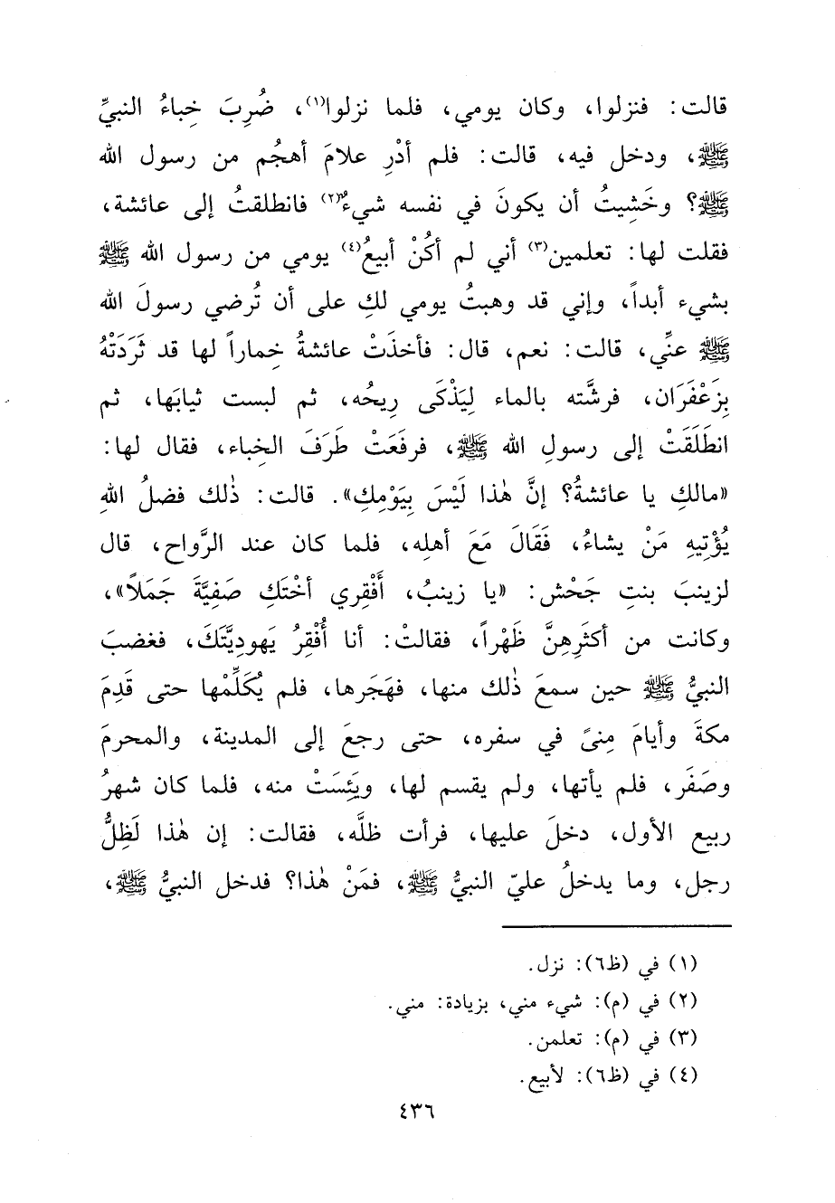 قَالَتْ: فَنَزَلُوا، وَكَانَ يَوْمِي، فَلَمَّا نَزَلُوا (١) ، ضُرِبَ خِبَاءُ النَّبِيِّ صَلَّى اللهُ عَلَيْهِ وَسَلَّمَ، وَدَخَلَ فِيهِ، قَالَتْ: فَلَمْ أَدْرِ عَلَامَ أُهْجَمُ مِنْ رَسُولِ اللهِ صَلَّى اللهُ عَلَيْهِ وَسَلَّمَ؟ وَخَشِيتُ أَنْ يَكُونَ فِي نَفْسِهِ شَيْءٌ (٢) ، فَانْطَلَقْتُ إِلَى عَائِشَةَ، فَقُلْتُ لَهَا: تَعْلَمِينَ (٣) أَنِّي لَمْ أَكُنْ أَبِيعُ (٤) يَوْمِي مِنْ رَسُولِ اللهِ صَلَّى اللهُ عَلَيْهِ وَسَلَّمَ بِشَيْءٍ أَبَدًا، وَإِنِّي قَدْ وَهَبْتُ يَوْمِي لَكِ عَلَى أَنْ تُرْضِي رَسُولَ اللهِ صَلَّى اللهُ عَلَيْهِ وَسَلَّمَ عَنِّي، قَالَتْ: نَعَمْ، قَالَ: فَأَخَذَتْ عَائِشَةُ خِمَارًا لَهَا قَدْ ثَرَدَتْهُ بِزَعْفَرَانٍ، فَرَشَّتْهُ بِالْمَاءِ لِيُذَكِّيَ رِيحَهُ، ثُمَّ لَبِسَتْ ثِيَابَهَا، ثُمَّ انْطَلَقَتْ إِلَى رَسُولِ اللهِ صَلَّى اللهُ عَلَيْهِ وَسَلَّمَ، فَرَفَعَتْ طَرَفَ الْخِبَاءِ، فَقَالَ لَهَا: " مَا لَكِ يَا عَائِشَةُ؟ إِنَّ هَذَا لَيْسَ بِيَوْمِكِ ". قَالَتْ: ذَلِكَ فَضْلُ اللهِ يُؤْتِيهِ مَنْ يَشَاءُ، فَقَالَ مَعَ أَهْلِهِ، فَلَمَّا كَانَ عِنْدَ الرَّوَاحِ، قَالَ لِزَيْنَبَ بِنْتِ جَحْشٍ: " يَا زَيْنَبُ، أَفْقِرِي أُخْتَكِ صَفِيَّةَ جَمَلًا "، وَكَانَتْ مِنْ أَكْثَرِهِنَّ ظَهْرًا، فَقَالَتْ: أَنَا أُفْقِرُ يَهُودِيَّتَكَ، فَغَضِبَ النَّبِيُّ صَلَّى اللهُ عَلَيْهِ وَسَلَّمَ حِينَ سَمِعَ ذَلِكَ مِنْهَا، فَهَجَرَهَا، فَلَمْ يُكَلِّمْهَا حَتَّى قَدِمَ مَكَّةَ وَأَيَّامَ مِنًى فِي سَفَرِهِ، حَتَّى رَجَعَ إِلَى الْمَدِينَةِ، وَالْمُحَرَّمَ وَصَفَرَ، فَلَمْ يَأْتِهَا، وَلَمْ يَقْسِمْ لَهَا، وَيَئِسَتْ مِنْهُ، فَلَمَّا كَانَ شَهْرُ رَبِيعٍ الْأَوَّلِ، دَخَلَ عَلَيْهَا، فَرَأَتْ ظِلَّهُ، فَقَالَتْ: إِنَّ هَذَا لَظِلُّ رَجُلٍ، وَمَا يَدْخُلُ عَلَيَّ النَّبِيُّ صَلَّى اللهُ عَلَيْهِ وَسَلَّمَ، فَمَنْ هَذَا؟ فَدَخَلَ النَّبِيُّ صَلَّى اللهُ عَلَيْهِ وَسَلَّمَ،