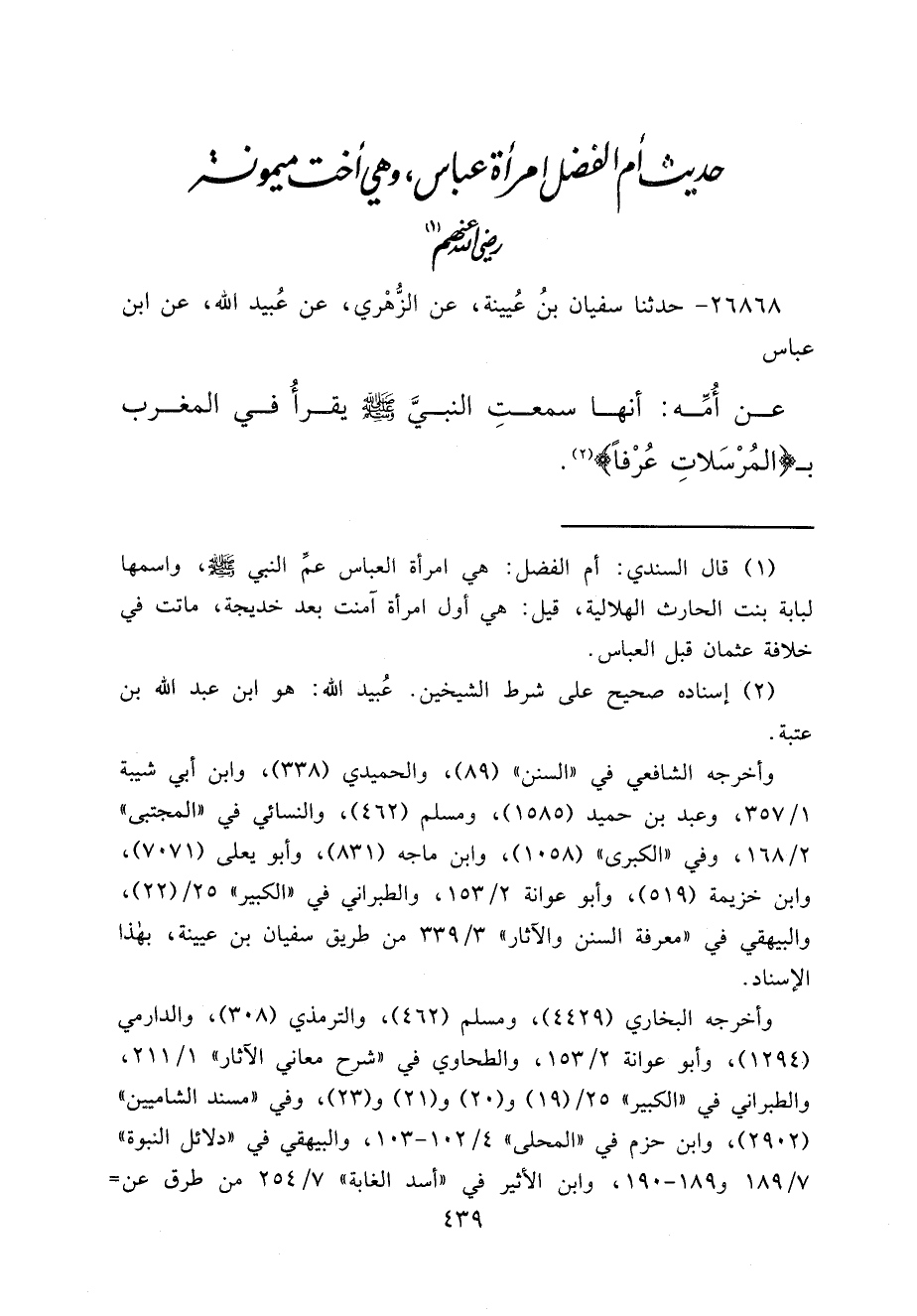 ٢٦٨٦٨ - حَدَّثَنَا سُفْيَانُ بْنُ عُيَيْنَةَ، عَنِ الزُّهْرِيِّ، عَنْ عُبَيْدِ اللهِ، عَنِ ابْنِ عَبَّاسٍ، عَنْ أُمِّهِ، أَنَّهَا " سَمِعَتِ النَّبِيَّ صَلَّى اللهُ عَلَيْهِ وَسَلَّمَ يَقْرَأُ فِي الْمَغْرِبِ بِالْمُرْسَلَاتِ عُرْفًا " (٢)