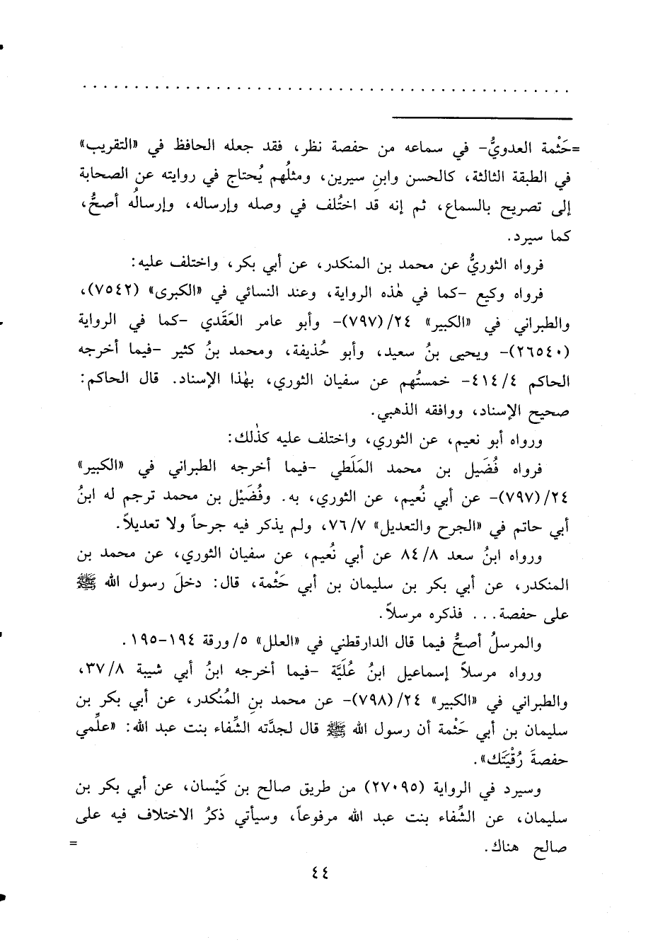 = حَثْمة العدويُّ - في سماعه من حفصة نظر، فقد جعله الحافظ في "التقريب" في الطبقة الثالثة، كالحسن وابنِ سيرين، ومثلُهم يُحتاج في روايته عن الصحابة إلى تصريح بالسماع، ثم إنه قد اختُلف في وصله وإرساله، وإرسالُه أصحُّ، كما سيرد.