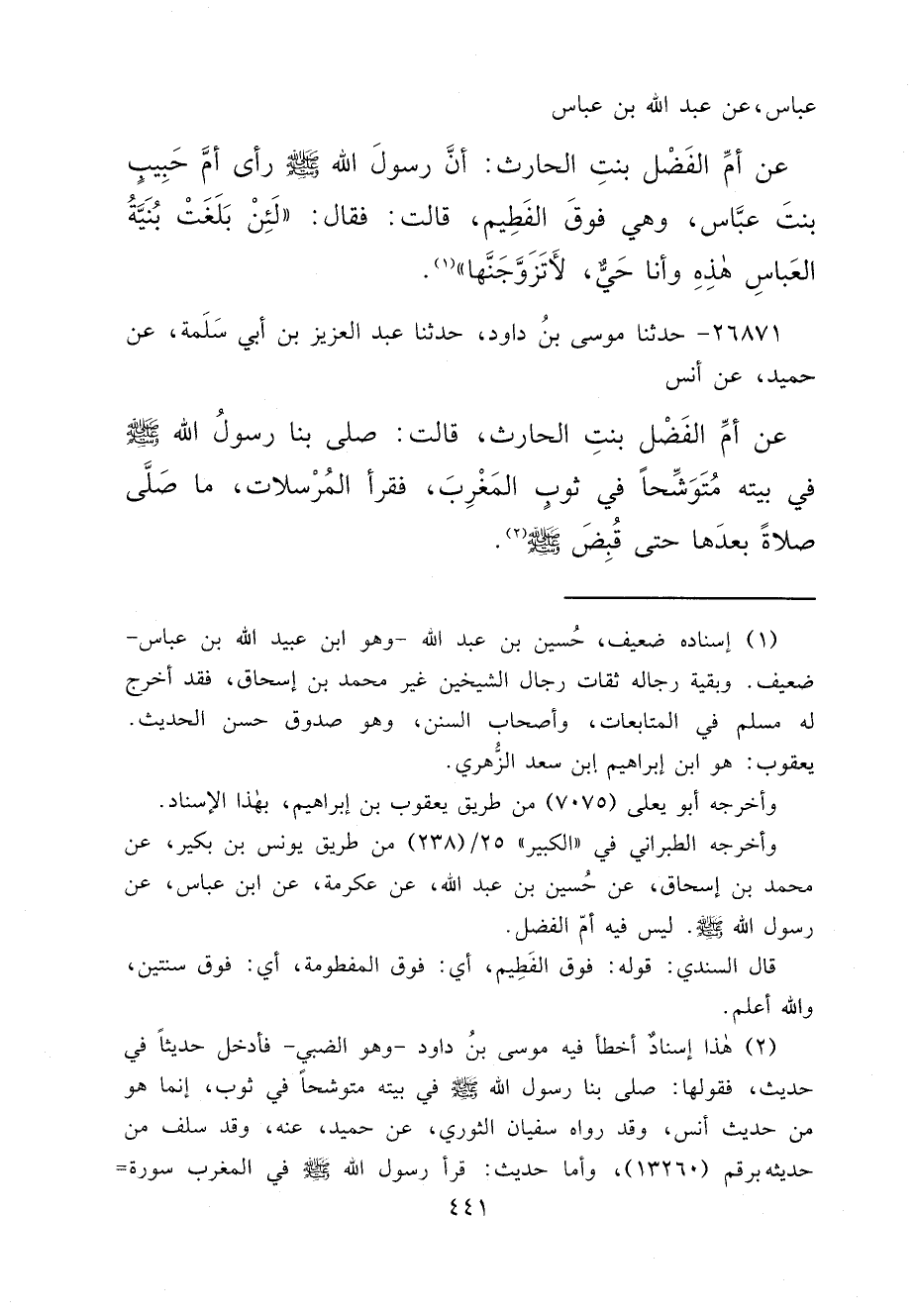 عَبَّاسٍ، عَنْ عَبْدِ اللهِ بْنِ عَبَّاسٍ، عَنْ أُمِّ الْفَضْلِ بِنْتِ الْحَارِثِ: أَنَّ رَسُولَ اللهِ صَلَّى اللهُ عَلَيْهِ وَسَلَّمَ رَأَى أُمَّ حَبِيبِ بِنْتَ عَبَّاسٍ، وَهِيَ فَوْقَ الْفَطِيمِ، قَالَتْ: فَقَالَ: " لَئِنْ بَلَغَتْ بُنَيَّةُ الْعَبَّاسِ هَذِهِ وَأَنَا حَيٌّ، لَأَتَزَوَّجَنَّهَا " (١)
