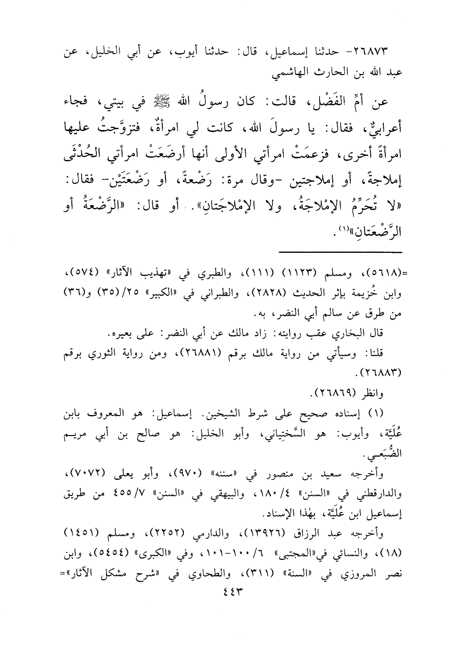 ٢٦٨٧٣ - حَدَّثَنَا إِسْمَاعِيلُ، قَالَ: حَدَّثَنَا أَيُّوبُ، عَنْ أَبِي الْخَلِيلِ، عَنْ عَبْدِ اللهِ بْنِ الْحَارِثِ الْهَاشِمِيِّ، عَنْ أُمِّ الْفَضْلِ، قَالَتْ: كَانَ رَسُولُ اللهِ صَلَّى اللهُ عَلَيْهِ وَسَلَّمَ فِي بَيْتِي، فَجَاءَ أَعْرَابِيٌّ، فَقَالَ: يَا رَسُولَ اللهِ، كَانَتْ لِي امْرَأَةٌ، فَتَزَوَّجْتُ عَلَيْهَا امْرَأَةً أُخْرَى، فَزَعَمَتْ امْرَأَتِي الْأُولَى أَنَّهَا أَرْضَعَتْ امْرَأَتِي الْحُدْثَى إِمْلَاجَةً، أَوْ إِمْلَاجَتَيْنِ، وَقَالَ مَرَّةً: رَضْعَةً، أَوْ رَضْعَتَيْنِ، فَقَالَ: " لَا تُحَرِّمُ الْإِمْلَاجَةُ، وَلَا الْإِمْلَاجَتَانِ " أَوْ قَالَ: " الرَّضْعَةُ أَوِ الرَّضْعَتَانِ " (١)