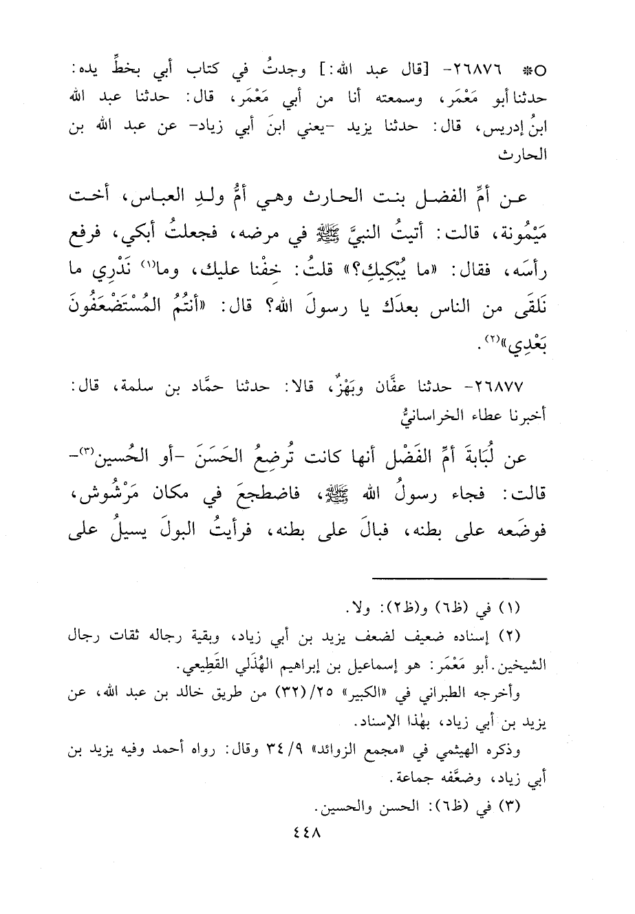 °* ٢٦٨٧٦ -[قَالَ عَبْدُ اللهِ:] وَجَدْتُ فِي كِتَابِ أَبِي، حَدَّثَنَا أَبُو مَعْمَرٍ، وَسَمِعْتُهُ أَنَا مِنْ أَبِي مَعْمَرٍ، قَالَ: حَدَّثَنَا عَبْدُ اللهِ بْنُ إِدْرِيسَ، قَالَ: حَدَّثَنَا يَزِيدُ يَعْنِي ابْنَ أَبِي زِيَادٍ، عَنْ عَبْدِ اللهِ بْنِ الْحَارِثِ، عَنْ أُمِّ الْفَضْلِ بِنْتِ الْحَارِثِ، وَهِيَ أُمُّ وَلَدِ الْعَبَّاسِ، أُخْتُ مَيْمُونَةَ، قَالَتْ: أَتَيْتُ النَّبِيَّ صَلَّى اللهُ عَلَيْهِ وَسَلَّمَ فِي مَرَضِهِ، فَجَعَلْتُ أَبْكِي، فَرَفَعَ رَأْسَهُ، فَقَالَ: " مَا يُبْكِيكِ؟ " قُلْتُ: خِفْنَا عَلَيْكَ، وَمَا (١) نَدْرِي مَا نَلْقَى مِنَ النَّاسِ بَعْدَكَ يَا رَسُولَ اللهِ؟ قَالَ: " أَنْتُمُ الْمُسْتَضْعَفُونَ بَعْدِي " (٢)