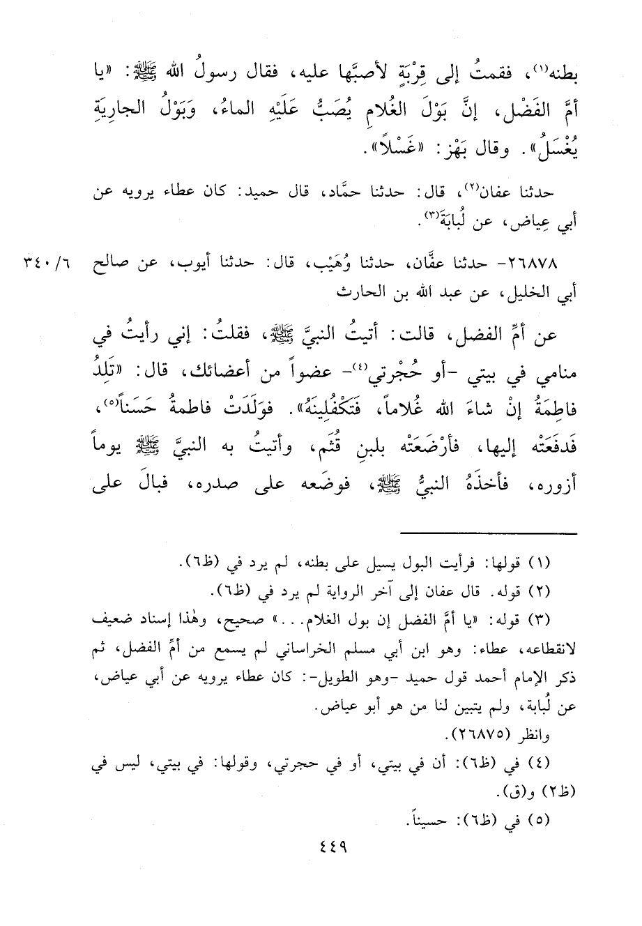 ٢٦٨٧٨ - حَدَّثَنَا عَفَّانُ، حَدَّثَنَا وُهَيْبٌ، قَالَ: حَدَّثَنَا أَيُّوبُ، عَنْ صَالِحٍ أَبِي الْخَلِيلِ، عَنْ عَبْدِ اللهِ بْنِ الْحَارِثِ، عَنْ أُمِّ الْفَضْلِ، قَالَتْ: أَتَيْتُ النَّبِيَّ صَلَّى اللهُ عَلَيْهِ وَسَلَّمَ، فَقُلْتُ: إِنِّي رَأَيْتُ فِي مَنَامِي، فِي بَيْتِي، أَوْ حُجْرَتِي (٤) عُضْوًا مِنْ أَعْضَائِكَ، قَالَ: " تَلِدُ فَاطِمَةُ إِنْ شَاءَ اللهُ غُلَامًا، فَتَكْفُلِينَهُ " فَوَلَدَتْ فَاطِمَةُ حَسَنًا (٥) ، فَدَفَعَتْهُ إِلَيْهَا، فَأَرْضَعَتْهُ بِلَبَنِ قُثَمَ، وَأَتَيْتُ بِهِ النَّبِيَّ صَلَّى اللهُ عَلَيْهِ وَسَلَّمَ يَوْمًا أَزُورُهُ، فَأَخَذَهُ النَّبِيُّ صَلَّى اللهُ عَلَيْهِ وَسَلَّمَ، فَوَضَعَهُ عَلَى صَدْرِهِ، فَبَالَ عَلَى