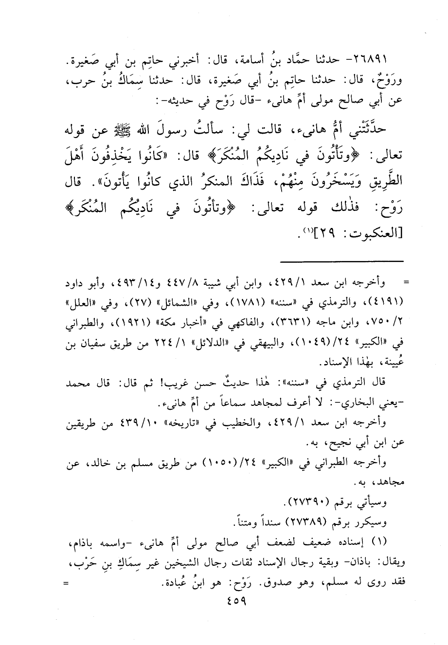 ٢٦٨٩١ - حَدَّثَنَا حَمَّادُ بْنُ أُسَامَةَ، قَالَ: أَخْبَرَنِي حَاتِمُ بْنُ أَبِي صَغِيرَةَ، وَرَوْحٌ، قَالَ: حَدَّثَنَا حَاتِمُ بْنُ أَبِي صَغِيرَةَ، قَالَ: حَدَّثَنَا سِمَاكُ بْنُ حَرْبٍ، عَنْ أَبِي صَالِحٍ، مَوْلَى أُمِّ هَانِئٍ، قَالَ رَوْحٌ، فِي حَدِيثِهِ: حَدَّثَتْنِي أُمُّ هَانِئٍ، قَالَتْ لِي: سَأَلْتُ رَسُولَ اللهِ صَلَّى اللهُ عَلَيْهِ وَسَلَّمَ عَنْ قَوْلِهِ تَعَالَى: {وَتَأْتُونَ فِي نَادِيكُمُ الْمُنْكَرَ} [العنكبوت: ٢٩] قَالَ: " كَانُوا يَخْذِفُونَ أَهْلَ الطَّرِيقِ وَيَسْخَرُونَ مِنْهُمْ، فَذَاكَ الْمُنْكَرُ الَّذِي كَانُوا يَأْتُونَ " قَالَ رَوْحٌ: فَذَلِكَ قَوْلُهُ تَعَالَى: {وَتَأْتُونَ فِي نَادِيكُمُ الْمُنْكَرَ} [العنكبوت: ٢٩] (١)