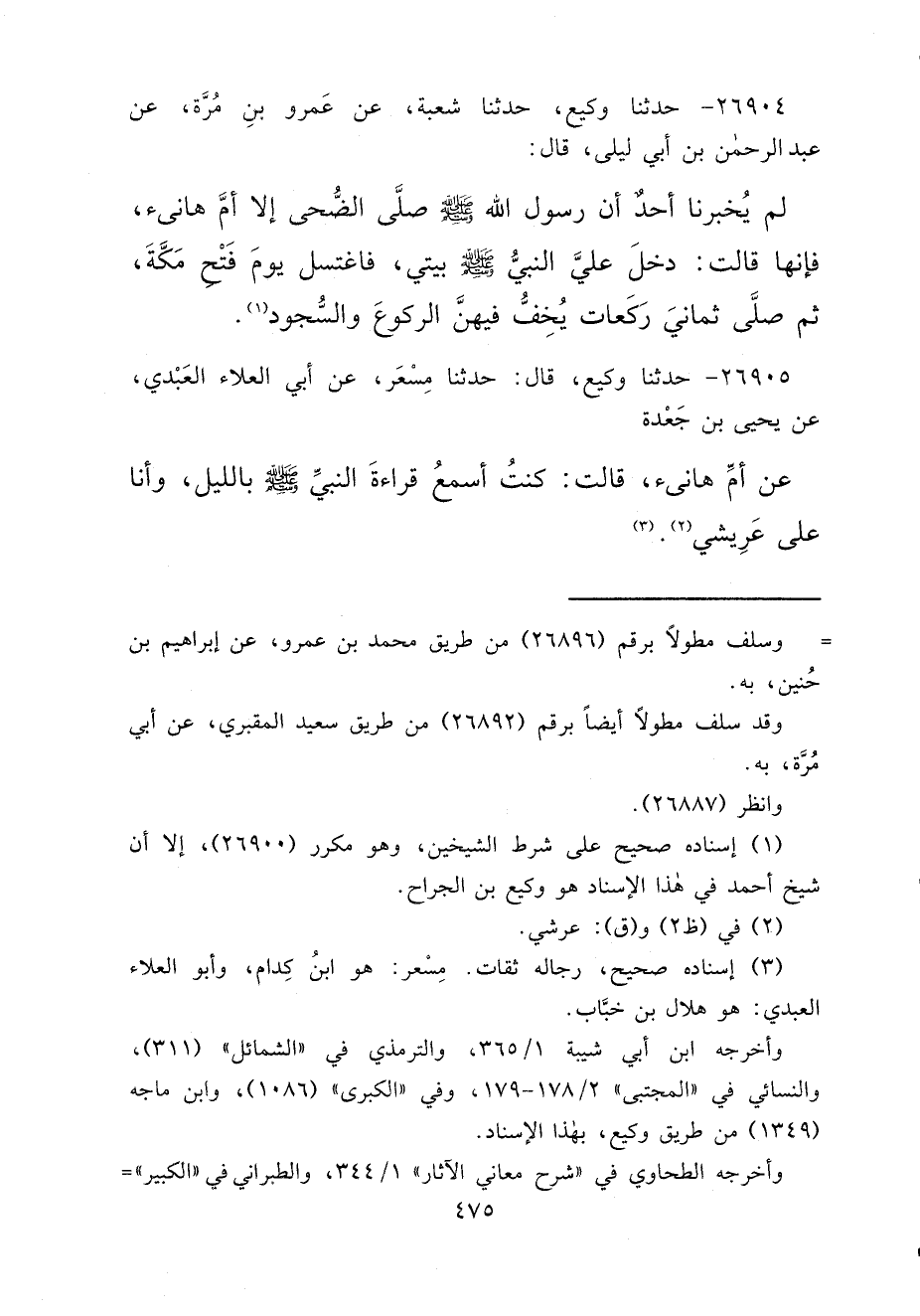 ٢٦٩٠٤ - حَدَّثَنَا وَكِيعٌ، حَدَّثَنَا شُعْبَةُ، عَنْ عَمْرِو بْنِ مُرَّةَ، عَنْ عَبْدِ الرَّحْمَنِ بْنِ أَبِي لَيْلَى، قَالَ: لَمْ يُخْبِرْنَا أَحَدٌ أَنَّ رَسُولَ اللهِ صَلَّى اللهُ عَلَيْهِ وَسَلَّمَ صَلَّى الضُّحَى إِلَّا أُمَّ هَانِئٍ، فَإِنَّهَا قَالَتْ: " دَخَلَ عَلَيَّ النَّبِيُّ صَلَّى اللهُ عَلَيْهِ وَسَلَّمَ بَيْتِي، فَاغْتَسَلَ يَوْمَ فَتْحِ مَكَّةَ، ثُمَّ صَلَّى ثَمَانِيَ رَكَعَاتٍ يُخِفُّ فِيهِنَّ الرُّكُوعَ وَالسُّجُودَ " (١)