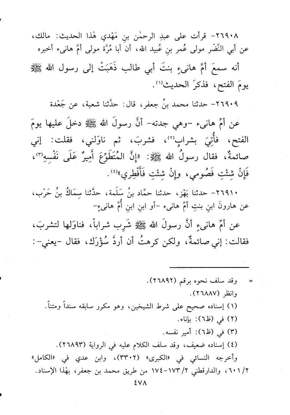 ٢٦٩٠٨ - قَرَأْتُ عَلَى عَبْدِ الرَّحْمَنِ بْنِ مَهْدِيٍّ، هَذَا الْحَدِيثَ: مَالِكٌ، عَنْ أَبِي النَّضْرِ، مَوْلَى عُمَرَ بْنِ عُبَيْدِ اللهِ، أَنَّ أَبَا مُرَّةَ، مَوْلَى أُمِّ هَانِئٍ، أَخْبَرَهُ أَنَّهُ سَمِعَ أُمَّ هَانِئٍ بِنْتَ أَبِي طَالِبٍ، ذَهَبَتْ إِلَى رَسُولِ اللهِ صَلَّى اللهُ عَلَيْهِ وَسَلَّمَ يَوْمَ الْفَتْحِ، فَذَكَرَ الْحَدِيثَ (١)