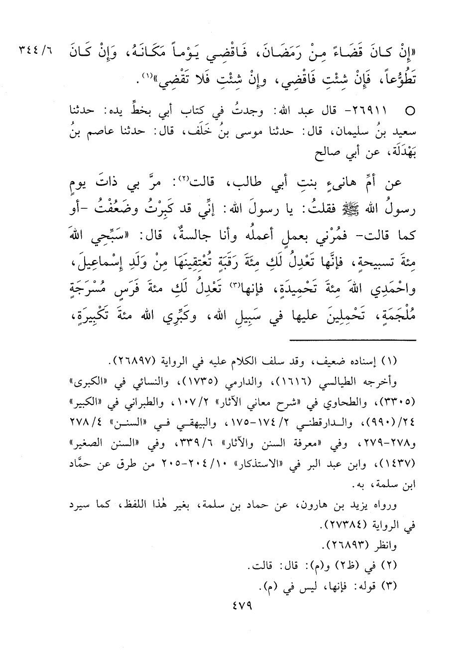 ° ٢٦٩١١ - حَدَّثَنَا سَعِيدُ بْنُ سُلَيْمَانَ، قَالَ: حَدَّثَنَا مُوسَى بْنُ خَلَفٍ، قَالَ: حَدَّثَنَا عَاصِمُ بْنُ بَهْدَلَةَ، عَنْ أَبِي صَالِحٍ، عَنْ أُمِّ هَانِئٍ بِنْتِ أَبِي طَالِبٍ، قَالَتْ (٢) : مَرَّ بِي ذَاتَ يَوْمٍ رَسُولُ اللهِ صَلَّى اللهُ عَلَيْهِ وَسَلَّمَ فَقُلْتُ: يَا رَسُولَ اللهِ: إِنِّي قَدْ كَبِرْتُ وَضَعُفْتُ، أَوْ كَمَا قَالَتْ، فَمُرْنِي بِعَمَلٍ أَعْمَلُهُ وَأَنَا جَالِسَةٌ، قَالَ: " سَبِّحِي اللهَ مِائَةَ تَسْبِيحَةٍ، فَإِنَّهَا تَعْدِلُ لَكِ مِائَةَ رَقَبَةٍ تُعْتِقِينَهَا مِنْ وَلَدِ إِسْمَاعِيلَ، وَاحْمَدِي اللهَ مِائَةَ تَحْمِيدَةٍ، فإنها (٣) تَعْدِلُ لَكِ مِائَةَ فَرَسٍ مُسْرَجَةٍ مُلْجَمَةٍ، تَحْمِلِينَ عَلَيْهَا فِي سَبِيلِ اللهِ، وَكَبِّرِي اللهَ مِائَةَ تَكْبِيرَةٍ،