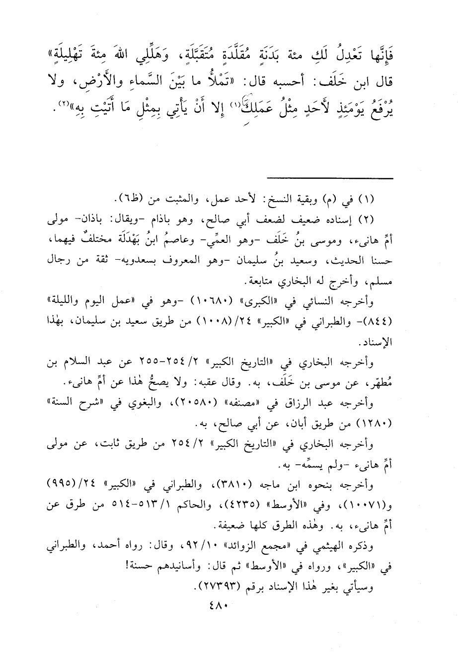 فَإِنَّهَا تَعْدِلُ لَكِ مِائَةَ بَدَنَةٍ مُقَلَّدَةٍ مُتَقَبَّلَةٍ، وَهَلِّلِي اللهَ مِائَةَ تَهْلِيلَةٍ، قَالَ ابْنُ خَلَفٍ: أَحْسِبُهُ قَالَ، تَمْلَأُ مَا بَيْنَ السَّمَاءِ وَالْأَرْضِ، وَلَا يُرْفَعُ يَوْمَئِذٍ لِأَحَدٍ مِثْلُ عَمَلِكَ (١) إِلَّا أَنْ يَأْتِيَ بِمِثْلِ مَا أَتَيْتِ بِهِ " (٢)