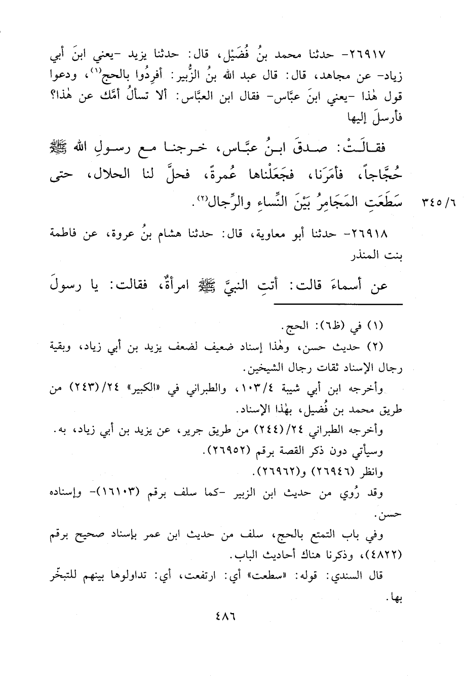٢٦٩١٧ - حَدَّثَنَا مُحَمَّدُ بْنُ فُضَيْلٍ، قَالَ: حَدَّثَنَا يَزِيدُ يَعْنِي ابْنَ أَبِي زِيَادٍ، عَنْ مُجَاهِدٍ، قَالَ: قَالَ عَبْدُ اللهِ بْنُ الزُّبَيْرِ: أَفْرِدُوا بِالْحَجِّ (١) ، وَدَعُوا قَوْلَ هَذَا، يَعْنِي ابْنَ عَبَّاسٍ، فَقَالَ ابْنُ الْعَبَّاسِ: أَلَا تَسْأَلُ أُمَّكَ، عَنْ هَذَا؟ فَأَرْسَلَ إِلَيْهَا، فَقَالَتْ: صَدَقَ ابْنُ عَبَّاسٍ، " خَرَجْنَا مَعَ رَسُولِ اللهِ صَلَّى اللهُ عَلَيْهِ وَسَلَّمَ حُجَّاجًا، فَأَمَرَنَا، فَجَعَلْنَاهَا عُمْرَةً، فَحَلَّ لَنَا الْحَلَالُ، حَتَّى سَطَعَتْ الْمَجَامِرُ بَيْنَ النِّسَاءِ وَالرِّجَالِ " (٢)