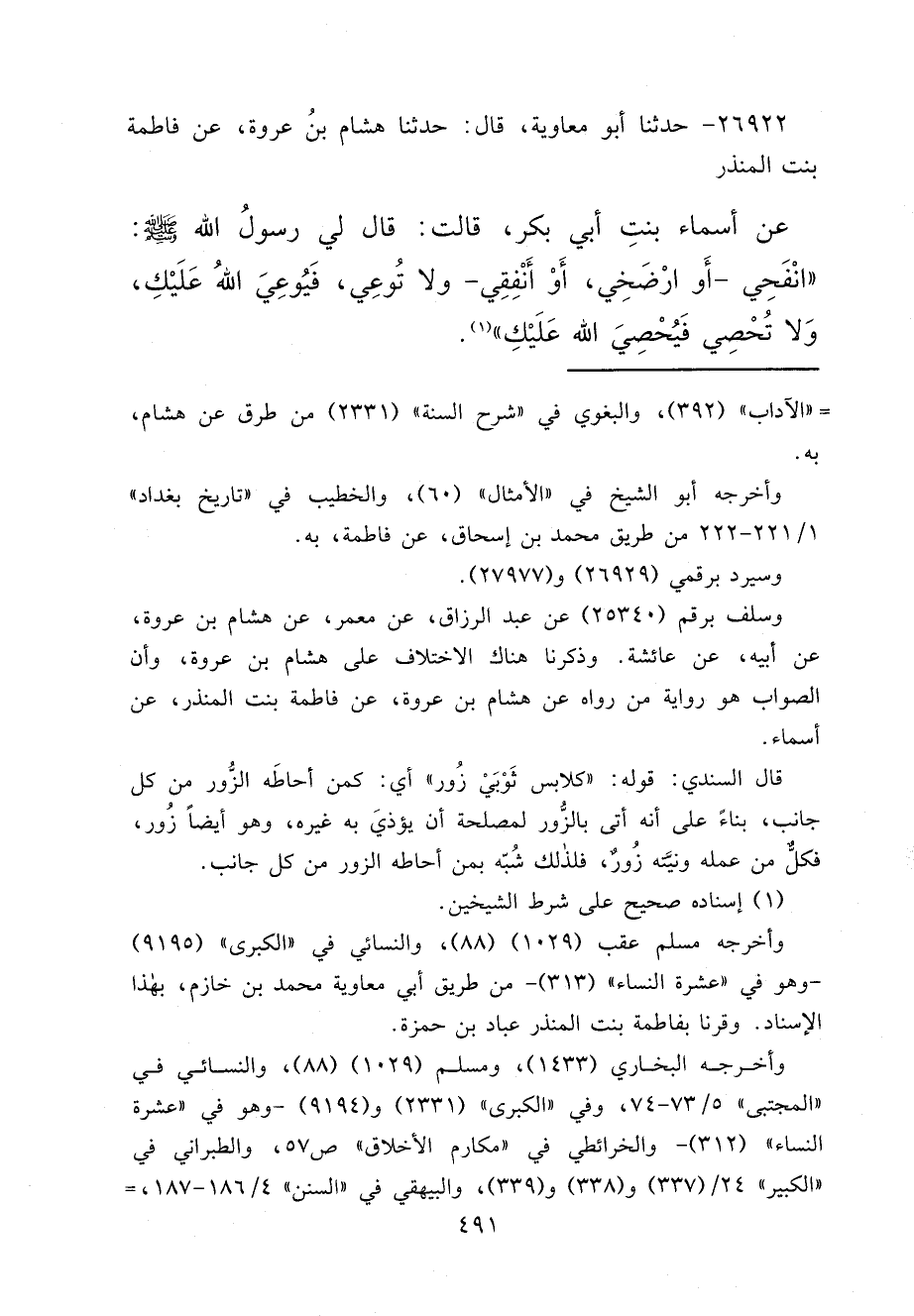 ٢٦٩٢٢ - حَدَّثَنَا أَبُو مُعَاوِيَةَ، قَالَ: حَدَّثَنَا هِشَامُ بْنُ عُرْوَةَ، عَنْ فَاطِمَةَ بِنْتِ الْمُنْذِرِ، عَنْ أَسْمَاءَ بِنْتِ أَبِي بَكْرٍ، قَالَتْ: قَالَ لِي رَسُولُ اللهِ صَلَّى اللهُ عَلَيْهِ وَسَلَّمَ: " انْفَحِي، أَوْ ارْضَخِي، أَوْ أَنْفِقِي، وَلَا تُوعِي، فَيُوعِيَ اللهُ عَلَيْكِ، وَلَا تُحْصِي فَيُحْصِيَ اللهُ عَلَيْكِ " (١)