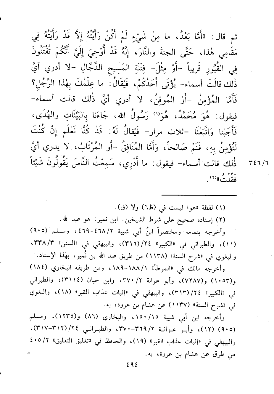 وأخرجه مالك في "الموطأ" ١/١٨٨-١٨٩، ومن طريقه البخاري (١٨٤) و (١٠٥٣) و (٧٢٨٧) ، وأبو عوانة ٢/٣٧٠، وابن حبان (٣١١٤) ، والطبراني في "الكبير" ٢٤/ (٣١٣) ، والبيهقي في "إثبات عذاب القبر" (١٨) ، والبغوي في "شرح السنة" (١١٣٧) عن هشام بن عروة، به.