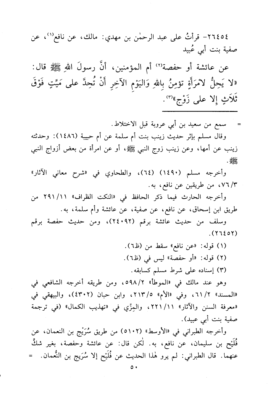 ٢٦٤٥٤ - قَرَأْتُ عَلَى عَبْدِ الرَّحْمَنِ بْنِ مَهْدِيٍّ، مَالِكٌ، عَنْ نَافِعٍ (١) ، عَنْ صَفِيَّةَ بِنْتِ أَبِي عُبَيْدٍ، عَنْ عَائِشَةَ أَوْ حَفْصَةَ (٢) أُمِّ الْمُؤْمِنِينَ أَنَّ رَسُولَ اللهِ صَلَّى اللهُ عَلَيْهِ وَسَلَّمَ قَالَ: " لَا يَحِلُّ لِامْرَأَةٍ تُؤْمِنُ بِاللهِ، وَالْيَوْمِ الْآخِرِ أَنْ تُحِدَّ عَلَى مَيِّتٍ فَوْقَ ثَلَاثٍ، إِلَّا عَلَى زَوْجٍ " (٣)
