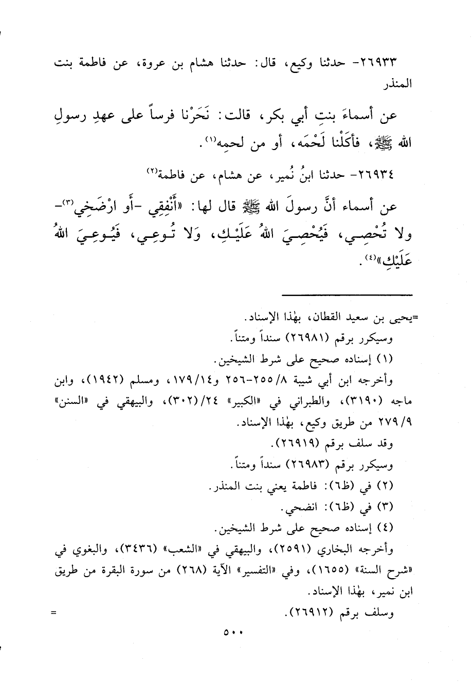 ٢٦٩٣٤ - حَدَّثَنَا ابْنُ نُمَيْرٍ، عَنْ هِشَامٍ، عَنْ فَاطِمَةَ (٢) ، عَنْ أَسْمَاءَ، أَنَّ رَسُولَ اللهِ صَلَّى اللهُ عَلَيْهِ وَسَلَّمَ قَالَ لَهَا: " أَنْفِقِي، أَوْ ارْضَخِي (٣) وَلَا تُحْصِي، فَيُحْصِيَ اللهُ عَلَيْكِ، وَلَا تُوعِي، فَيُوعِيَ اللهُ عَلَيْكِ " (٤)