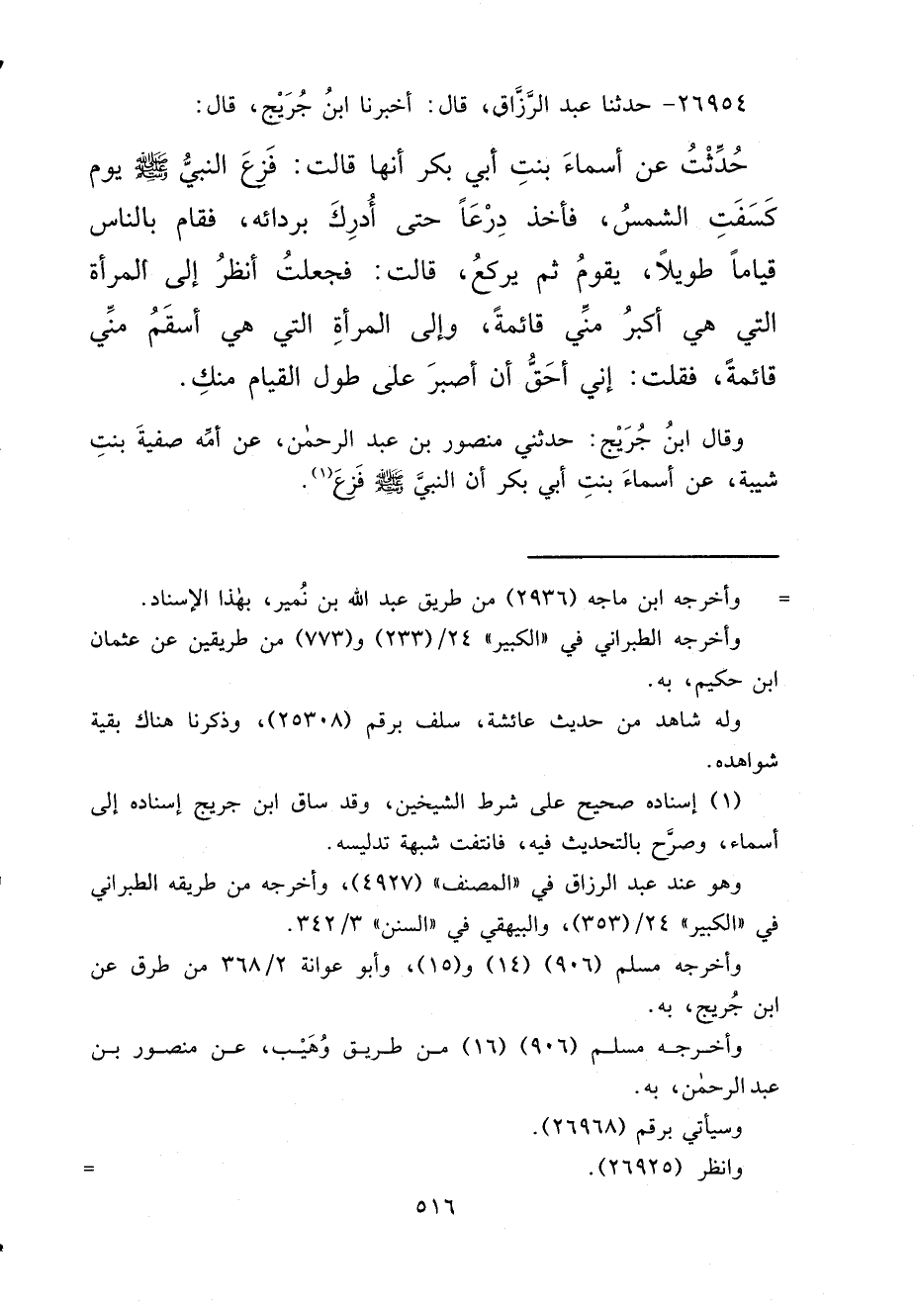 ٢٦٩٥٤ - حَدَّثَنَا عَبْدُ الرَّزَّاقِ، قَالَ: أَخْبَرَنَا ابْنُ جُرَيْجٍ، قَالَ: حُدِّثْتُ عَنْ أَسْمَاءَ بِنْتِ أَبِي بَكْرٍ، أَنَّهَا قَالَتْ: " فَزِعَ النَّبِيُّ صَلَّى اللهُ عَلَيْهِ وَسَلَّمَ يَوْمَ كَسَفَتِ الشَّمْسُ، فَأَخَذَ دِرْعًا حَتَّى أَدْرَكَ بِرِدَائِهِ، فَقَامَ بِالنَّاسِ قِيَامًا طَوِيلًا، يَقُومُ ثُمَّ يَرْكَعُ "، قَالَتْ: فَجَعَلْتُ أَنْظُرُ إِلَى الْمَرْأَةِ الَّتِي هِيَ أَكْبَرُ مِنِّي قَائِمَةً، وَإِلَى الْمَرْأَةِ الَّتِي هِيَ أَسْقَمُ مِنِّي قَائِمَةً، فَقُلْتُ: إِنِّي أَحَقُّ أَنْ أَصْبِرَ عَلَى طُولِ الْقِيَامِ مِنْكِ وقَالَ ابْنُ جُرَيْجٍ: حَدَّثَنِي مَنْصُورُ بْنُ عَبْدِ الرَّحْمَنِ، عَنْ أُمِّهِ صَفِيَّةَ بِنْتِ شَيْبَةَ، عَنْ أَسْمَاءَ بِنْتِ أَبِي بَكْرٍ، أَنَّ النَّبِيَّ صَلَّى اللهُ عَلَيْهِ وَسَلَّمَ فَزِعَ (١)