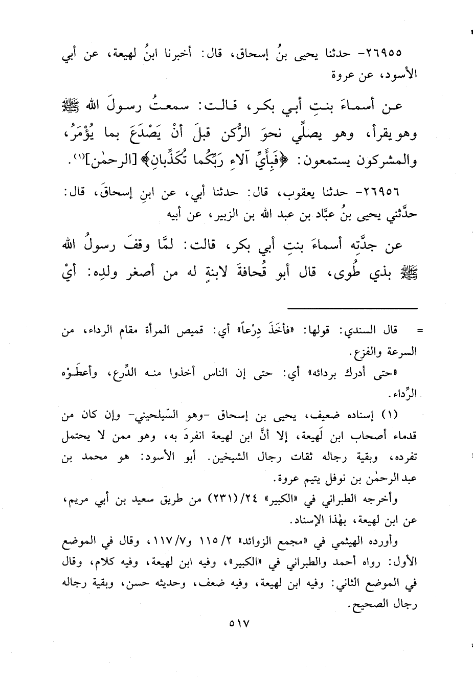 ٢٦٩٥٥ - حَدَّثَنَا يَحْيَى بْنُ إِسْحَاقَ، قَالَ: أَخْبَرَنَا ابْنُ لَهِيعَةَ، عَنْ أَبِي الْأَسْوَدِ، عَنْ عُرْوَةَ، عَنْ أَسْمَاءَ بِنْتِ أَبِي بَكْرٍ، قَالَتْ: " سَمِعْتُ رَسُولَ اللهِ صَلَّى اللهُ عَلَيْهِ وَسَلَّمَ وَهُوَ يَقْرَأُ وَهُوَ يُصَلِّي نَحْوَ الرُّكْنِ قَبْلَ أَنْ يَصْدَعَ بِمَا يُؤْمَرُ، وَالْمُشْرِكُونَ يَسْتَمِعُونَ {فَبِأَيِّ آلَاءِ رَبِّكُمَا تُكَذِّبَانِ} [الرحمن: ١٣] " (١)