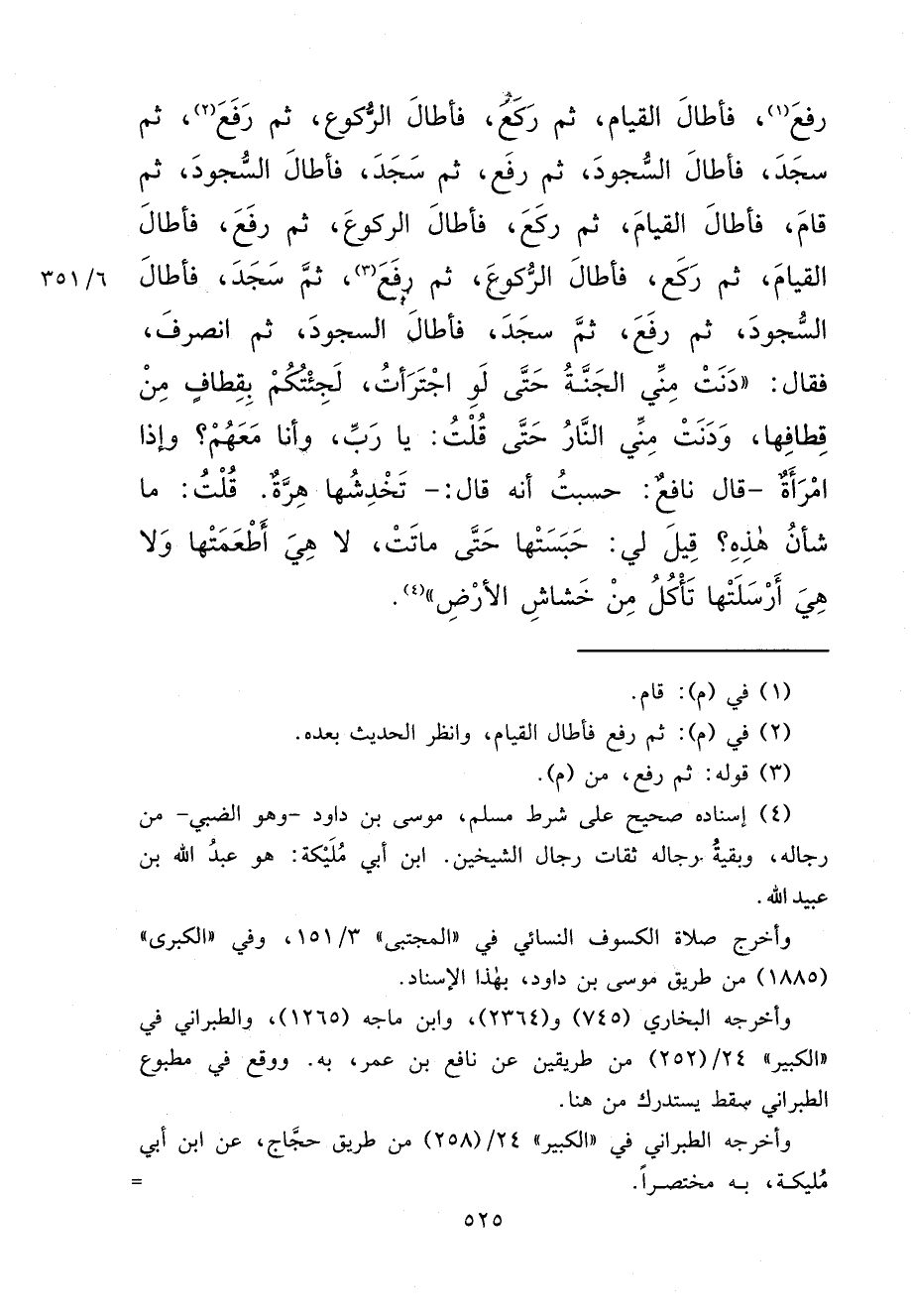 رَفَعَ (١) ، فَأَطَالَ الْقِيَامَ، ثُمَّ رَكَعَ، فَأَطَالَ الرُّكُوعَ، ثُمَّ رَفَعَ (٢) ، ثُمَّ سَجَدَ، فَأَطَالَ السُّجُودَ، ثُمَّ رَفَعَ، ثُمَّ سَجَدَ، فَأَطَالَ السُّجُودَ، ثُمَّ قَامَ، فَأَطَالَ الْقِيَامَ، ثُمَّ رَكَعَ، فَأَطَالَ الرُّكُوعَ، ثُمَّ رَفَعَ، فَأَطَالَ الْقِيَامَ، ثُمَّ رَكَعَ، فَأَطَالَ الرُّكُوعَ، ثُمَّ رَفَعَ، ثُمَّ سَجَدَ، فَأَطَالَ السُّجُودَ، ثُمَّ رَفَعَ (٣) ، ثُمَّ سَجَدَ، فَأَطَالَ السُّجُودَ، ثُمَّ انْصَرَفَ، فَقَالَ: " دَنَتْ مِنِّي الْجَنَّةُ حَتَّى لَوْ اجْتَرَأْتُ، لَجِئْتُكُمْ بِقِطَافٍ مِنْ قِطَافِهَا، وَدَنَتْ مِنِّي النَّارُ حَتَّى قُلْتُ: يَا رَبُّ، وَأَنَا مَعَهُمْ؟ وَإِذَا امْرَأَةٌ، قَالَ نَافِعٌ: حَسِبْتُ أَنَّهُ قَالَ، تَخْدِشُهَا هِرَّةٌ. قُلْتُ: مَا شَأْنُ هَذِهِ؟ قِيلَ لِي: حَبَسَتْهَا حَتَّى مَاتَتْ، لَا هِيَ أَطْعَمَتْهَا وَلَا هِيَ أَرْسَلَتْهَا تَأْكُلُ مِنْ خِشَاشِ الْأَرْضِ " (٤)