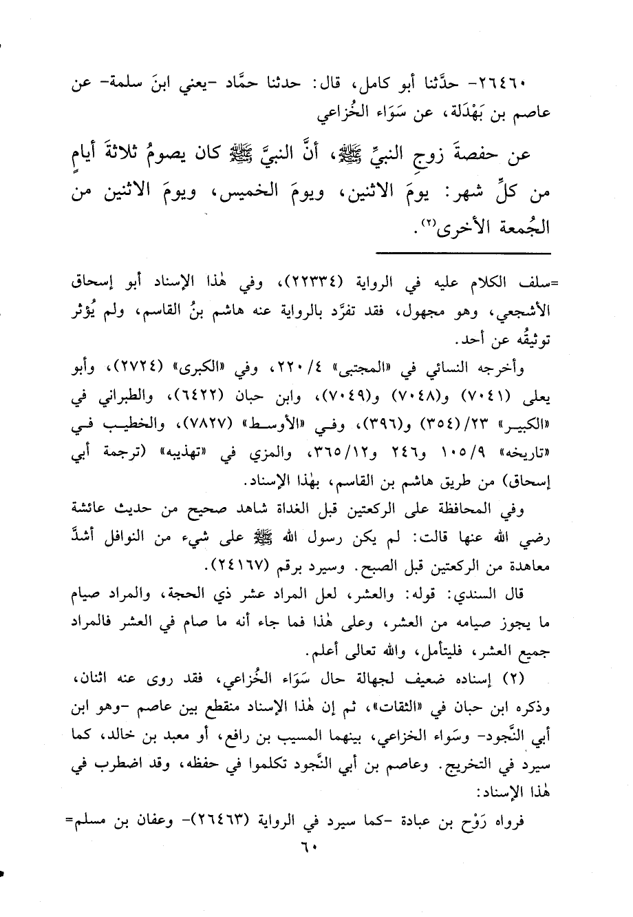 ٢٦٤٦٠ - حَدَّثَنَا أَبُو كَامِلٍ، قَالَ: حَدَّثَنَا حَمَّادٌ يَعْنِي ابْنَ سَلَمَةَ، عَنْ عَاصِمِ ابْنِ بَهْدَلَةَ، عَنْ سَوَاءٍ الْخُزَاعِيِّ، عَنْ حَفْصَةَ، زَوْجِ النَّبِيِّ صَلَّى اللهُ عَلَيْهِ وَسَلَّمَ " أَنَّ النَّبِيَّ صَلَّى اللهُ عَلَيْهِ وَسَلَّمَ كَانَ يَصُومُ ثَلَاثَةَ أَيَّامٍ مِنْ كُلِّ شَهْرٍ: يَوْمَ الِاثْنَيْنِ، وَيَوْمَ الْخَمِيسِ، وَيَوْمَ الِاثْنَيْنِ مِنَ الْجُمُعَةِ الْأُخْرَى " (١)