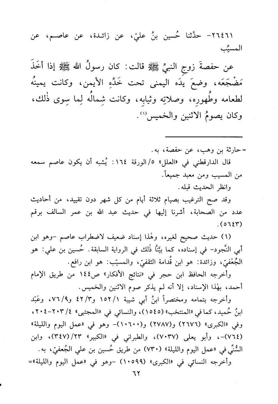 ٢٦٤٦١ - حَدَّثَنَا حُسَيْنُ بْنُ عَلِيٍّ، عَنْ زَائِدَةَ، عَنْ عَاصِمٍ، عَنِ الْمُسَيِّبِ، عَنْ حَفْصَةَ، زَوْجِ النَّبِيِّ صَلَّى اللهُ عَلَيْهِ وَسَلَّمَ قَالَتْ: " كَانَ رَسُولُ اللهِ صَلَّى اللهُ عَلَيْهِ وَسَلَّمَ إِذَا أَخَذَ مَضْجَعَهُ، وَضَعَ يَدَهُ الْيُمْنَى تَحْتَ خَدِّهِ الْأَيْمَنِ، وَكَانَتْ يَمِينُهُ لِطَعَامِهِ وَطُهُورِهِ، وَصَلَاتِهِ وَثِيَابِهِ، وَكَانَتْ شِمَالُهُ لِمَا سِوَى ذَلِكَ، وَكَانَ يَصُومُ الِاثْنَيْنِ وَالْخَمِيسَ " (١)