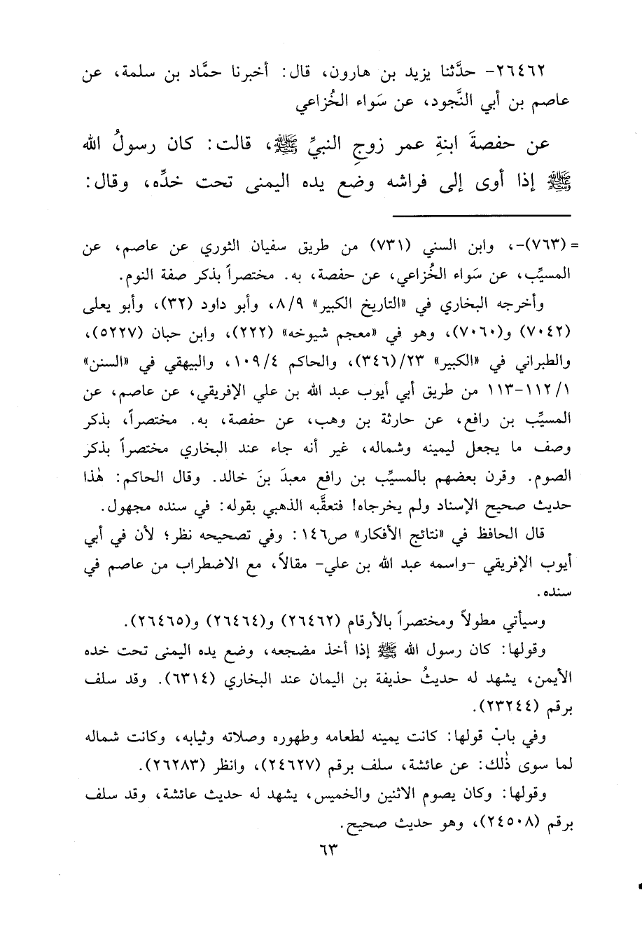 = (٧٦٣) -، وابن السني (٧٣١) من طريق سفيان الثوري عن عاصم، عن المسيِّب، عن سَواء الخُزاعي، عن حفصة، به. مختصراً بذكر صفة النوم.