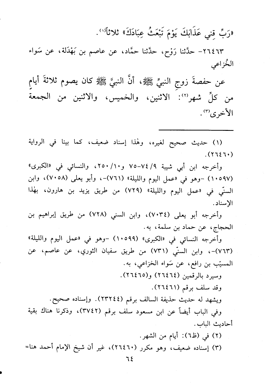 ٢٦٤٦٣ - حَدَّثَنَا رَوْحٌ، حَدَّثَنَا حَمَّادٌ، عَنْ عَاصِمِ بْنِ بَهْدَلَةَ، عَنْ سَوَاءٍ الْخُزَاعِيِّ، عَنِ حَفْصَةَ، زَوْجِ النَّبِيِّ صَلَّى اللهُ عَلَيْهِ وَسَلَّمَ " أَنَّ النَّبِيَّ صَلَّى اللهُ عَلَيْهِ وَسَلَّمَ، كَانَ يَصُومُ ثَلَاثَةَ أَيَّامٍ مِنْ كُلِّ شَهْرٍ (٢) : الِاثْنَيْنِ، وَالْخَمِيسَ، وَالِاثْنَيْنِ مِنَ الْجُمُعَةِ الْأُخْرَى " (٣)