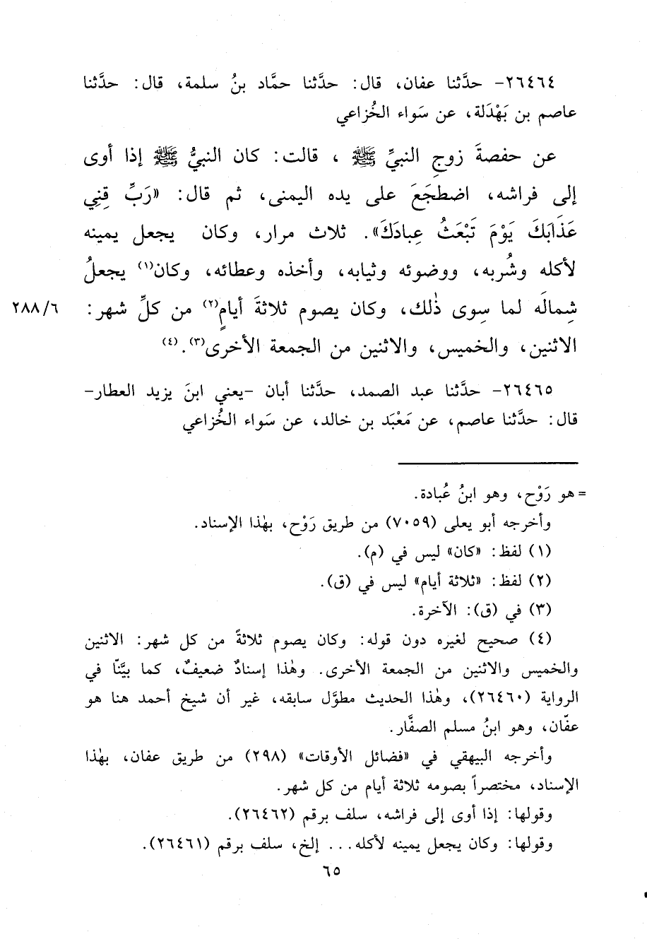 ٢٦٤٦٤ - حَدَّثَنَا عَفَّانُ، قَالَ: حَدَّثَنَا حَمَّادُ بْنُ سَلَمَةَ، قَالَ: حَدَّثَنَا عَاصِمُ بْنُ بَهْدَلَةَ، عَنْ سَوَاءٍ الْخُزَاعِيِّ، عَنْ حَفْصَةَ، زَوْجِ النَّبِيِّ صَلَّى اللهُ عَلَيْهِ وَسَلَّمَ قَالَتْ: كَانَ النَّبِيُّ صَلَّى اللهُ عَلَيْهِ وَسَلَّمَ إِذَا أَوَى إِلَى فِرَاشِهِ، اضْطَجَعَ عَلَى يَدِهِ الْيُمْنَى، ثُمَّ قَالَ: " رَبِّ قِنِي عَذَابَكَ يَوْمَ تَبْعَثُ عِبَادَكَ " ثَلَاثَ مِرَارٍ، وَكَانَ يَجْعَلُ يَمِينَهُ لِأَكْلِهِ وَشُرْبِهِ، وَوُضُوئِهِ وَثِيَابِهِ، وَأَخْذِهِ وَعَطَائِهِ، وَكان (١) يَجْعَلُ شِمَالَهُ لِمَا سِوَى ذَلِكَ، وَكَانَ يَصُومُ ثَلَاثَةَ أَيَّامٍ (٢) مِنْ كُلِّ شَهْرٍ: الِاثْنَيْنِ، وَالْخَمِيسَ، وَالِاثْنَيْنِ مِنَ الْجُمُعَةِ الْأُخْرَى (٣) " (٤)