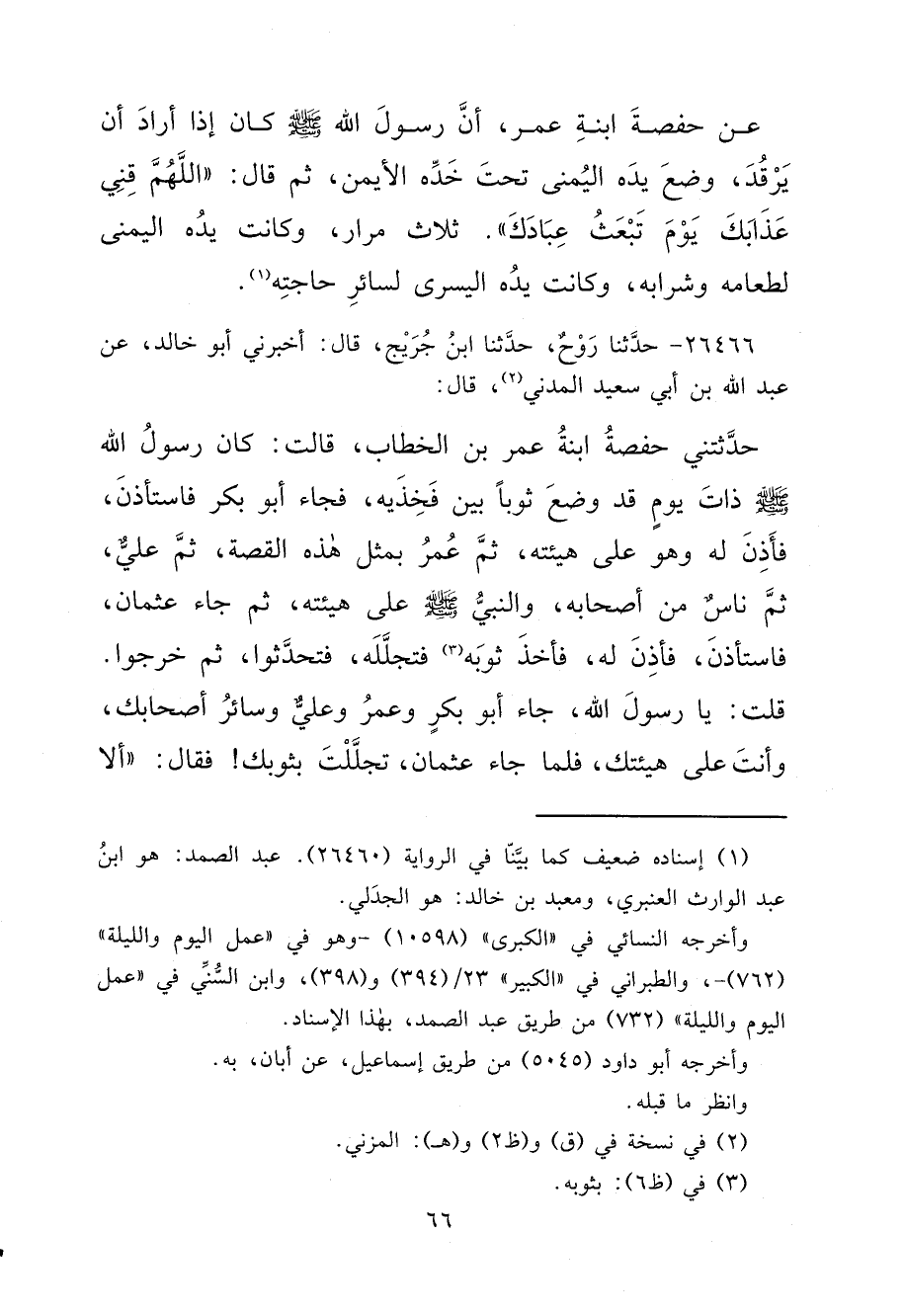 ٢٦٤٦٦ - حَدَّثَنَا رَوْحٌ، حَدَّثَنَا ابْنُ جُرَيْجٍ، قَالَ: أَخْبَرَنِي أَبُو خَالِدٍ، عَنْ عَبْدِ اللهِ بْنِ أَبِي سَعِيدٍ الْمُدَنِيِّ (٢) ، قَالَ: حَدَّثَتْنِي حَفْصَةُ ابْنَةُ عُمَرَ بْنِ الْخَطَّابِ، قَالَتْ: كَانَ رَسُولُ اللهِ صَلَّى اللهُ عَلَيْهِ وَسَلَّمَ ذَاتَ يَوْمٍ قَدْ وَضَعَ ثَوْبَهُ بَيْنَ فَخِذَيْهِ، فَجَاءَ أَبُو بَكْرٍ فَاسْتَأْذَنَ، فَأَذِنَ لَهُ وَهُوَ عَلَى هَيْئَتِهِ، ثُمَّ عُمَرُ بِمِثْلِ هَذِهِ الْقِصَّةِ، ثُمَّ عَلِيٌّ، ثُمَّ نَاسٌ مِنْ أَصْحَابِهِ، وَالنَّبِيُّ صَلَّى اللهُ عَلَيْهِ وَسَلَّمَ عَلَى هَيْئَتِهِ، ثُمَّ جَاءَ عُثْمَانُ، فَاسْتَأْذَنَ، فَأَذِنَ لَهُ، فَأَخَذَ ثَوْبَهُ (٣) فَتَجَلَّلَهُ، فَتَحَدَّثُوا، ثُمَّ خَرَجُوا. قُلْتُ: يَا رَسُولَ اللهِ، جَاءَ أَبُو بَكْرٍ، وَعُمَرُ، وَعَلِيٌّ وَسَائِرُ أَصْحَابِكَ، وَأَنْتَ عَلَى هَيْئَتِكَ، فَلَمَّا جَاءَ عُثْمَانُ، تَجَلَّلْتَ بِثَوْبِكَ فَقَالَ: " أَلَا