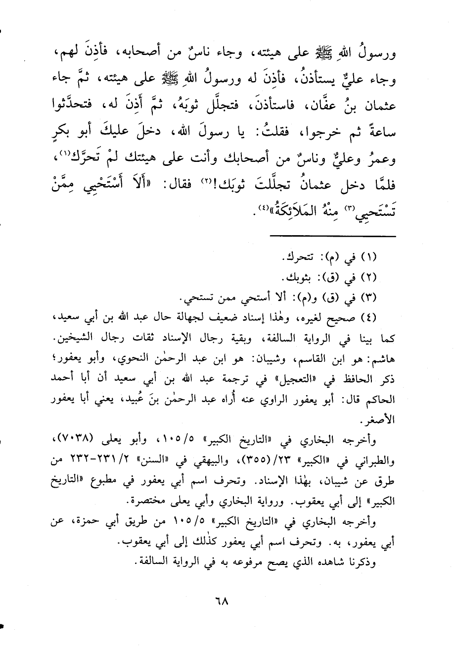 وَرَسُولُ اللهِ صَلَّى اللهُ عَلَيْهِ وَسَلَّمَ عَلَى هَيْئَتِهِ، وَجَاءَ نَاسٌ مِنْ أَصْحَابِهِ، فَأَذِنَ لَهُمْ وَجَاءَ عَلِيٌّ يَسْتَأْذِنُ فَأَذِنَ لَهُ وَرَسُولُ اللهِ صَلَّى اللهُ عَلَيْهِ وَسَلَّمَ عَلَى هَيْئَتِهِ، ثُمَّ جَاءَ عُثْمَانُ بْنُ عَفَّانَ فَاسْتَأْذَنَ، فَتَجَلَّلَ ثَوْبَهُ، ثُمَّ أَذِنَ لَهُ، فَتَحَدَّثُوا سَاعَةً ثُمَّ خَرَجُوا، فَقُلْتُ: يَا رَسُولَ اللهِ، دَخَلَ عَلَيْكَ أَبُو بَكْرٍ، وَعُمَرُ، وَعَلِيٌّ، وَنَاسٌ مِنْ أَصْحَابِكَ وَأَنْتَ عَلَى هَيْئَتِكَ لَمْ تَحَرَّكْ (١) ، فَلَمَّا دَخَلَ عُثْمَانُ تَجَلَّلْتَ ثَوْبَكَ (٢) فَقَالَ: " أَلَا أَسْتَحْيِي مِمَّنْ تَسْتَحْيِي (٣) مِنْهُ الْمَلَائِكَةُ " (٤)