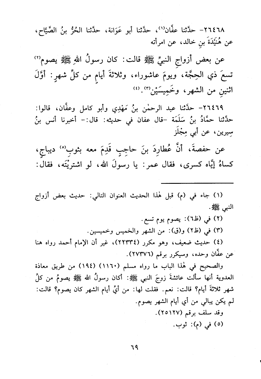 ٢٦٤٦٨ - حَدَّثَنَا عَفَّانُ (١) ، حَدَّثَنَا أَبُو عَوَانَةَ، حَدَّثَنَا الْحُرُّ بْنُ الصَّيَّاحِ، عَنْ هُنَيْدَةَ بْنِ خَالِدٍ، عَنِ امْرَأَتِهِ، عَنْ بَعْضِ أَزْوَاجِ النَّبِيِّ صَلَّى اللهُ عَلَيْهِ وَسَلَّمَ قَالَتْ: " كَانَ رَسُولُ اللهِ صَلَّى اللهُ عَلَيْهِ وَسَلَّمَ يَصُومُ (٢) تِسْعَ ذِي الْحِجَّةِ وَيَوْمَ عَاشُورَاءَ، وَثَلَاثَةَ أَيَّامٍ مِنْ كُلِّ شَهْرٍ، أَوَّلَ اثْنَيْنِ مِنَ الشَّهْرِ وَخَمِيسَيْنِ (٣) " (٤)